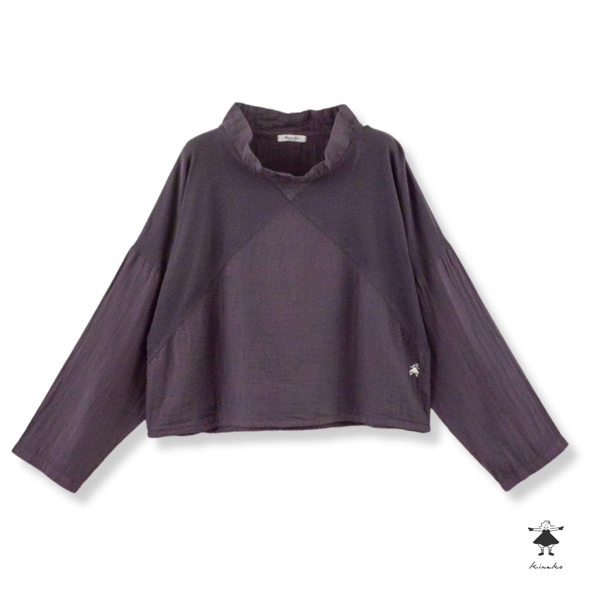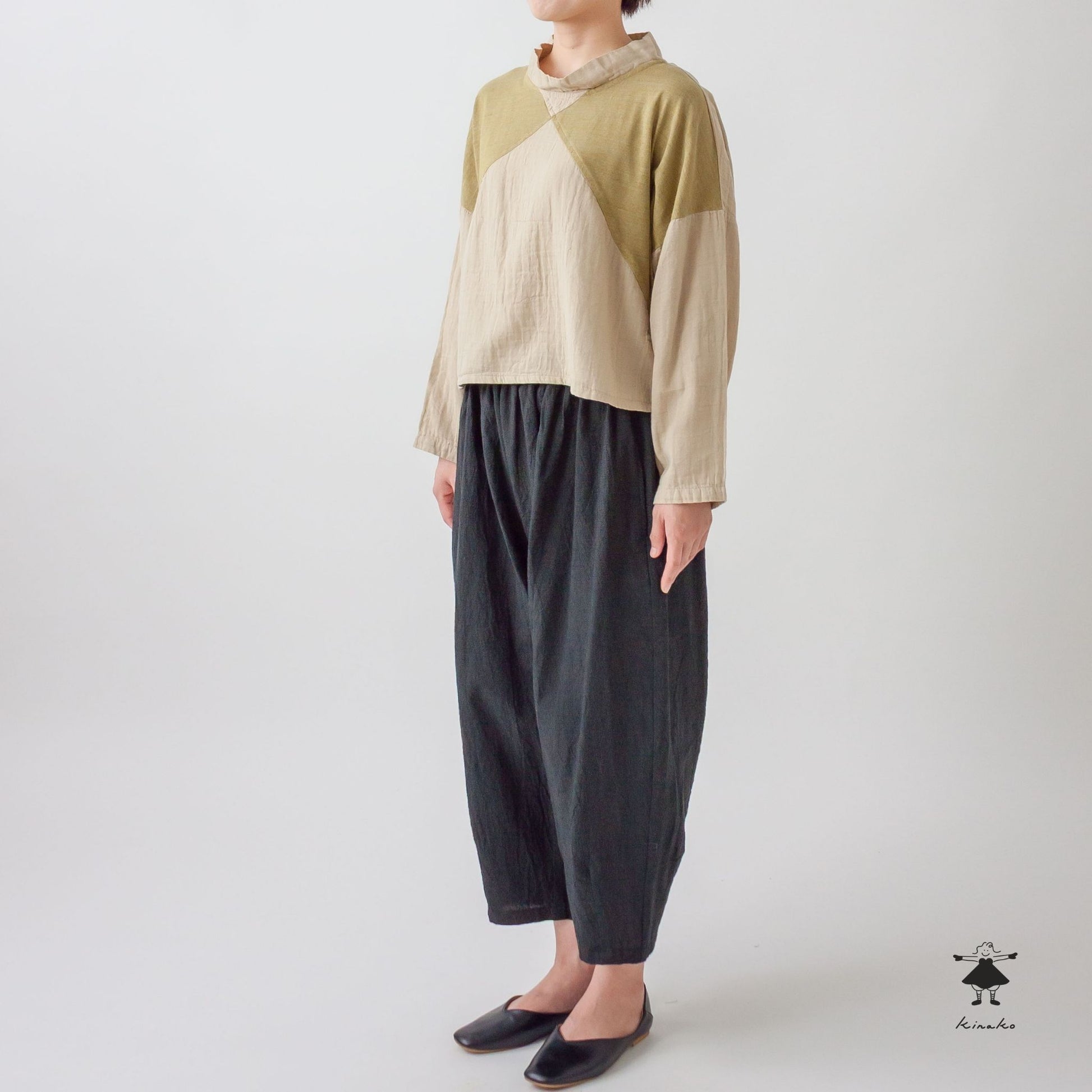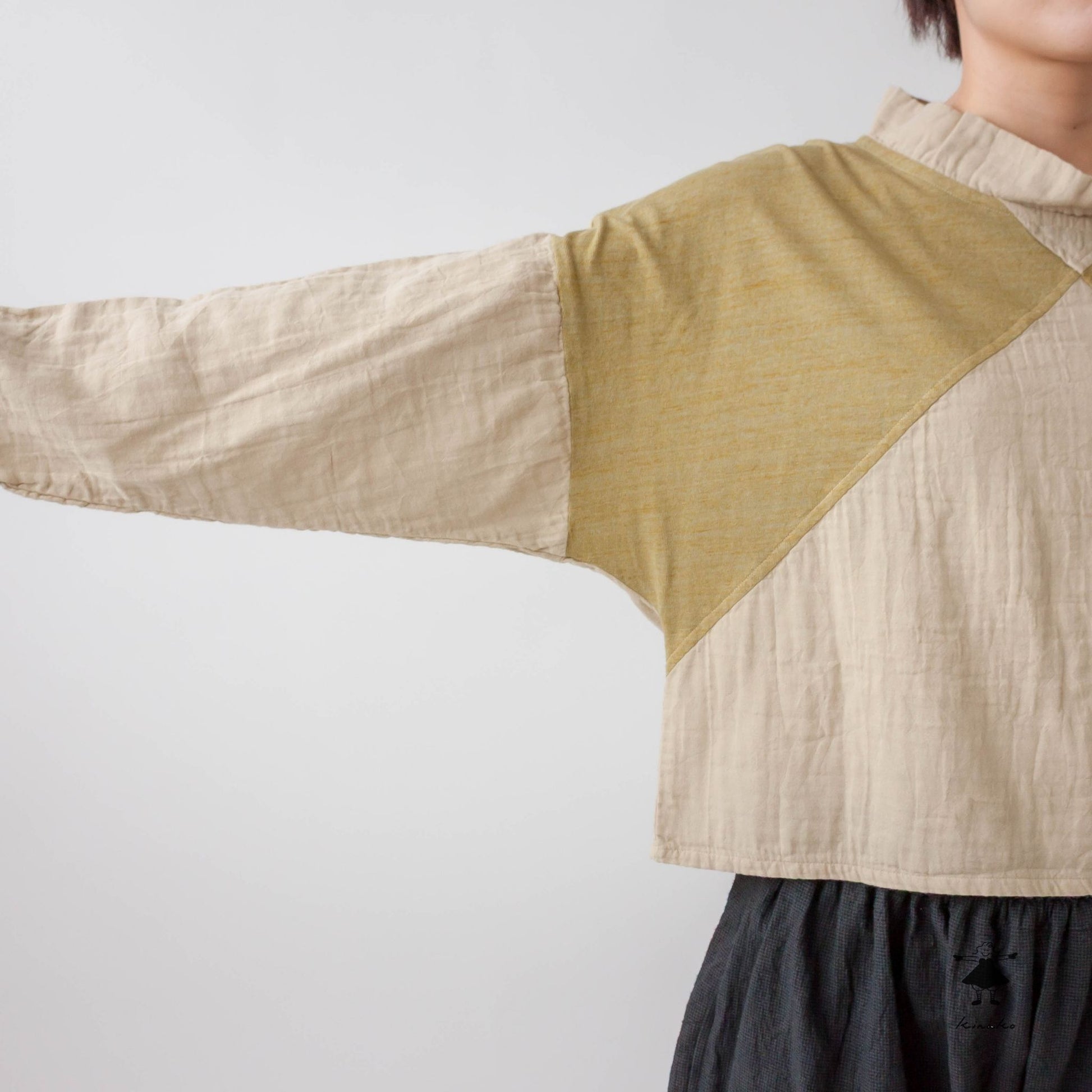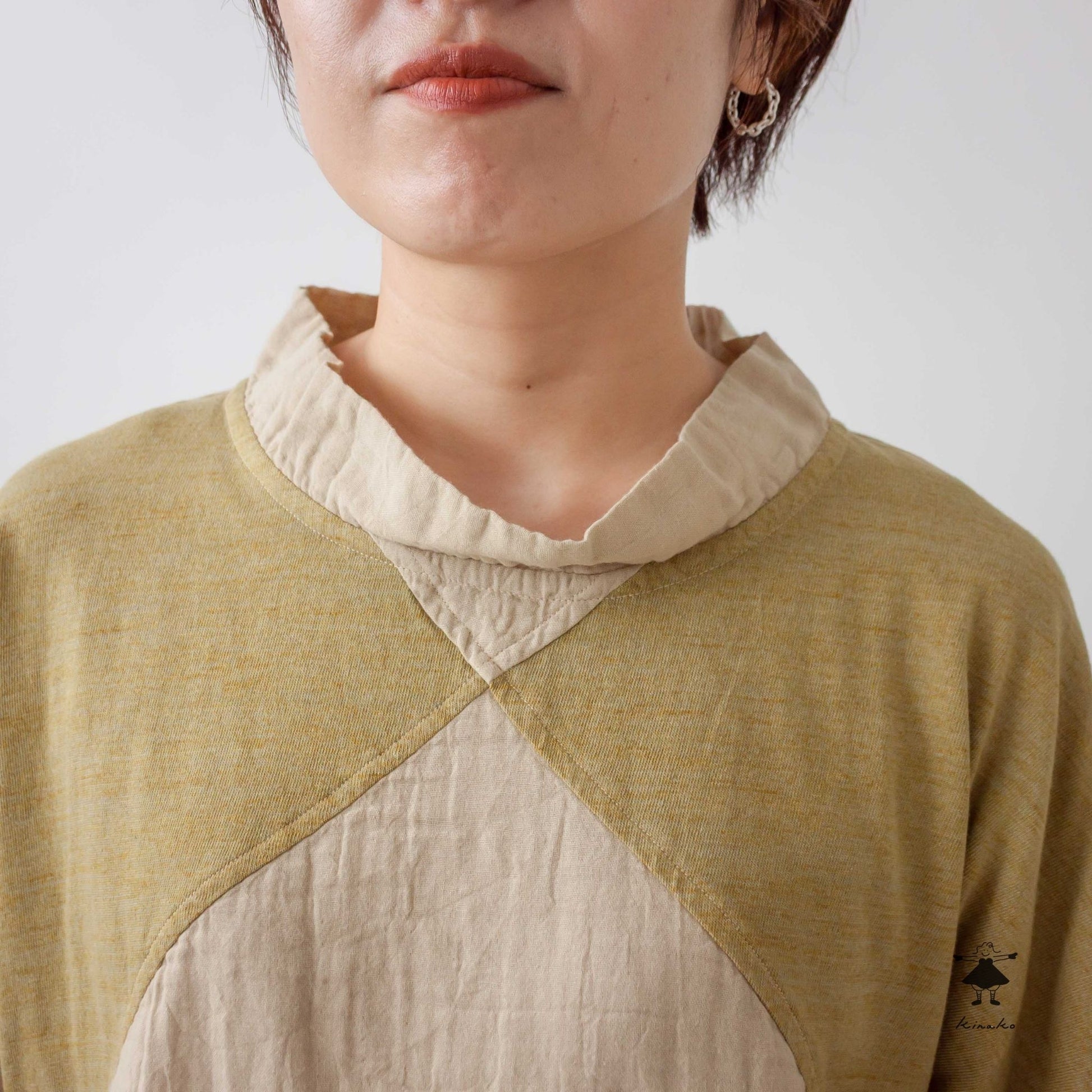 前身頃を天竺と切り替えたショートプルオーバーです。製品染めによる切替部分の濃淡がポイントです。左裾にきなこちゃん刺しゅう有り。