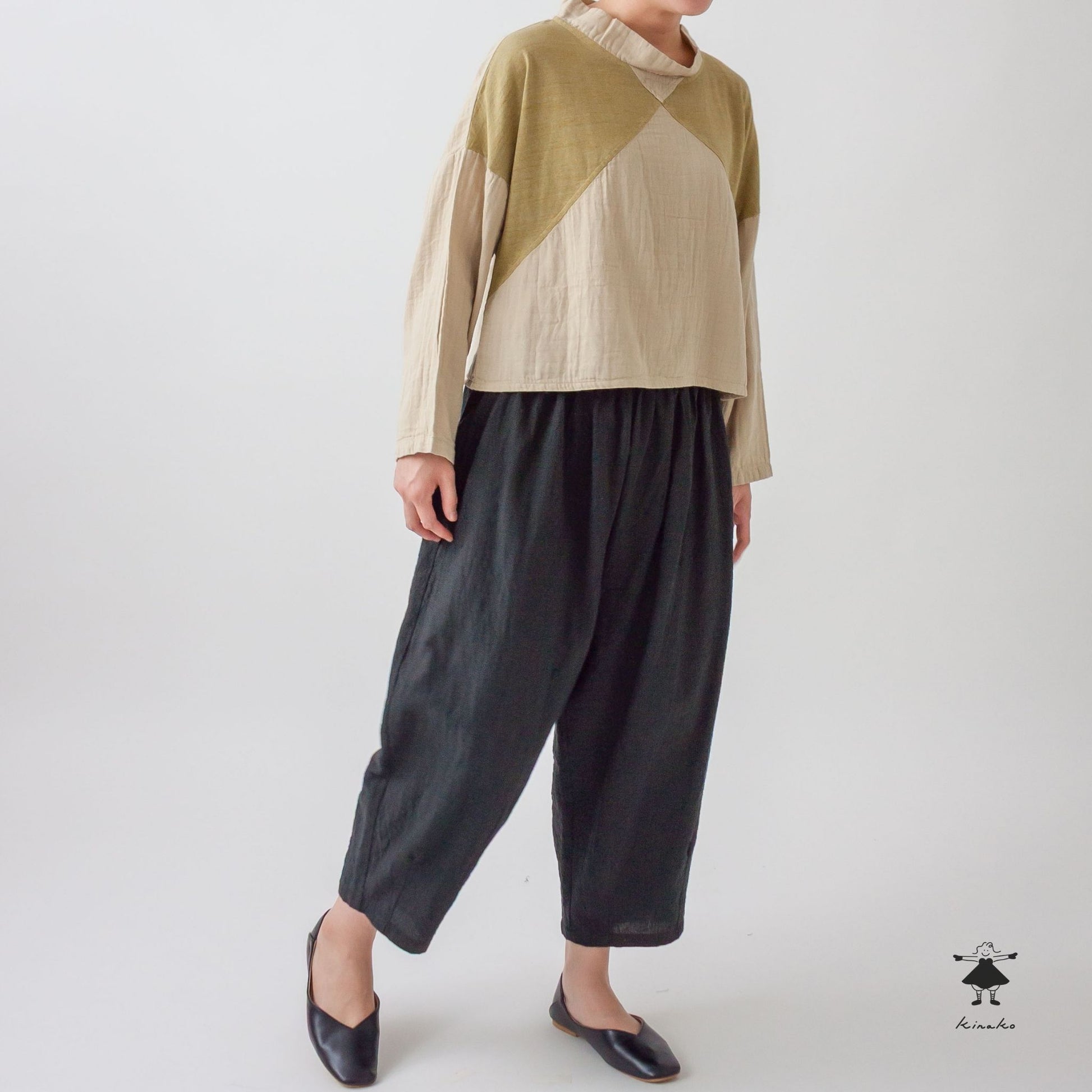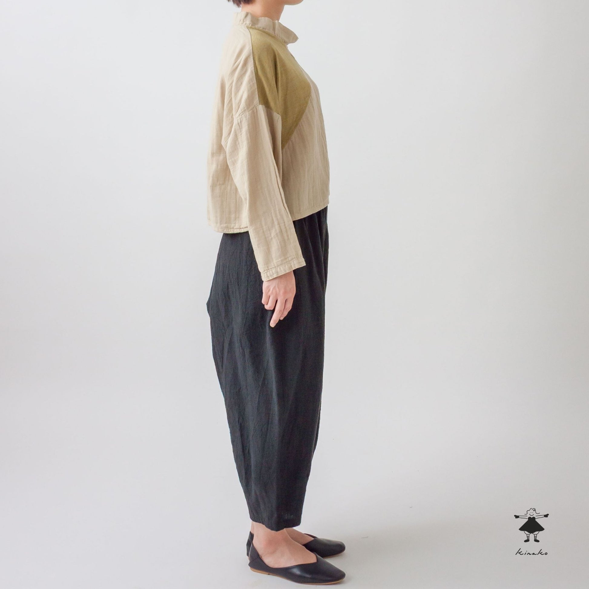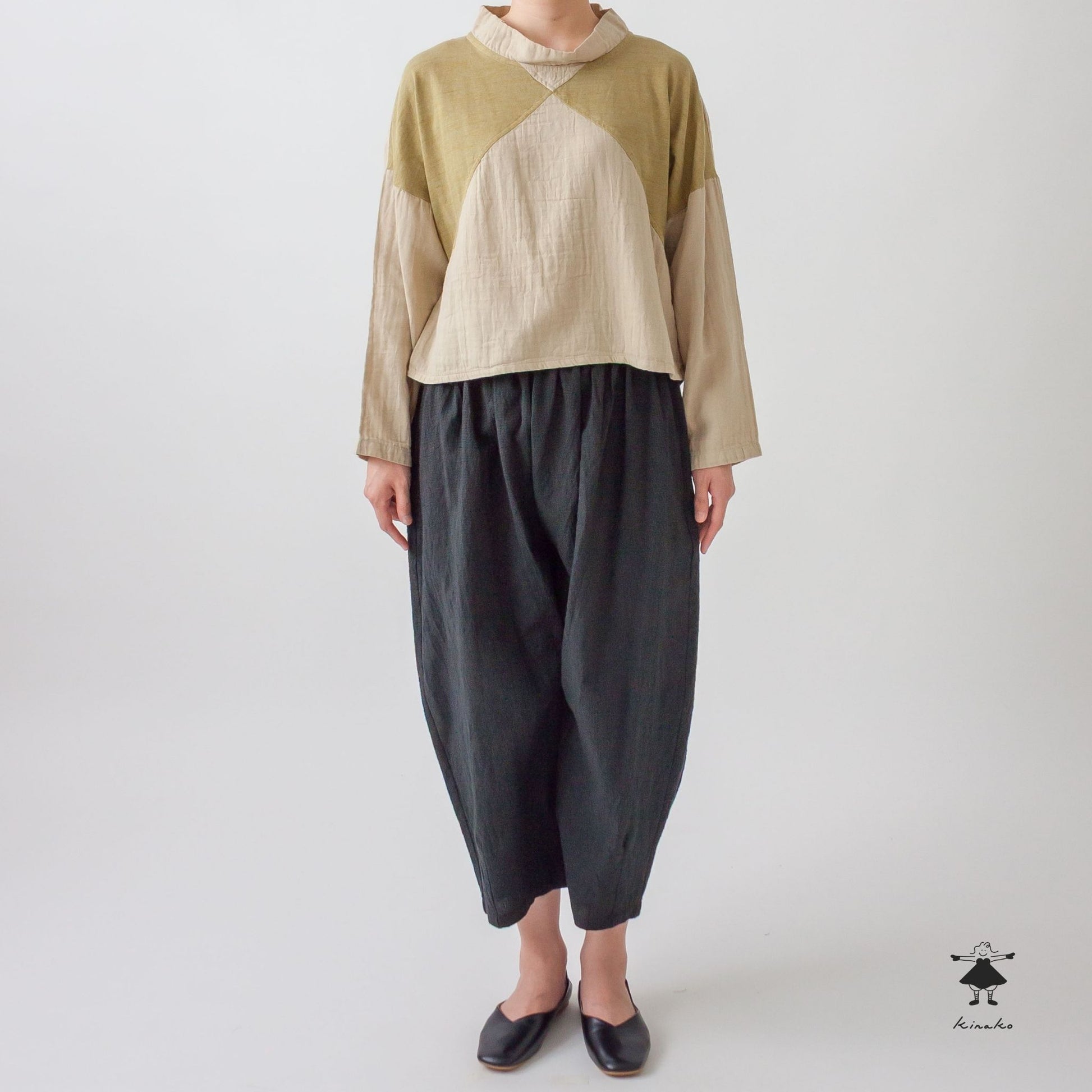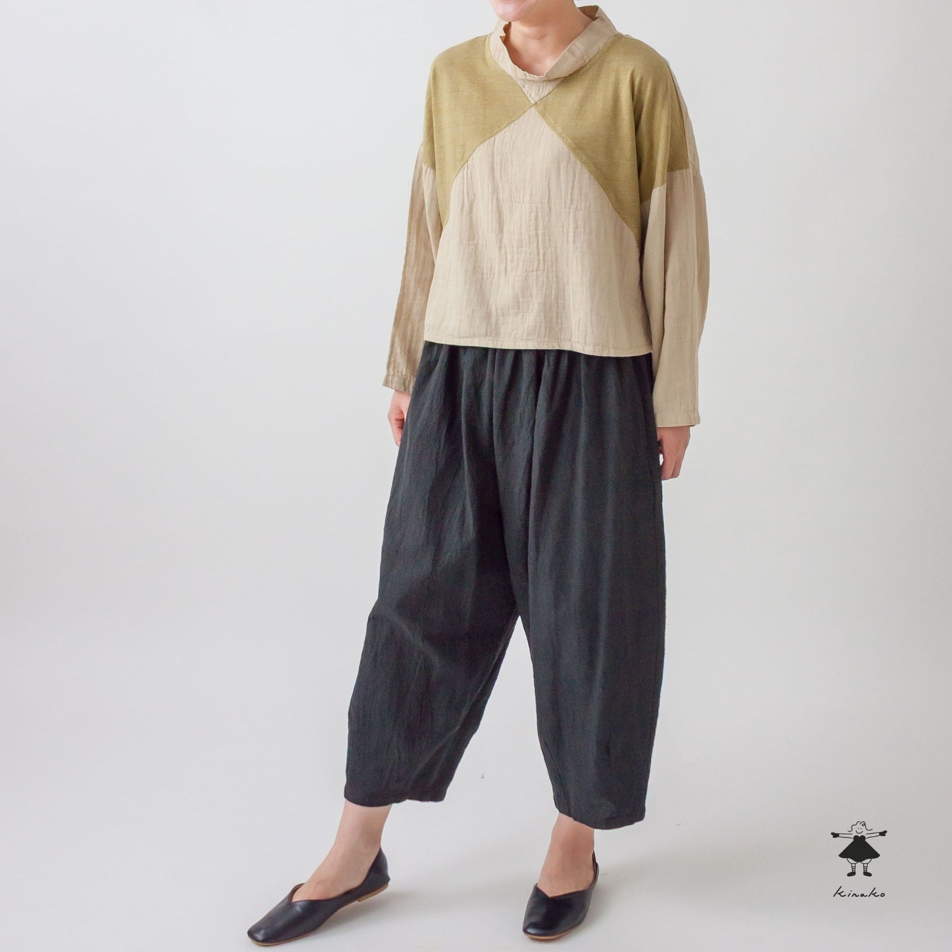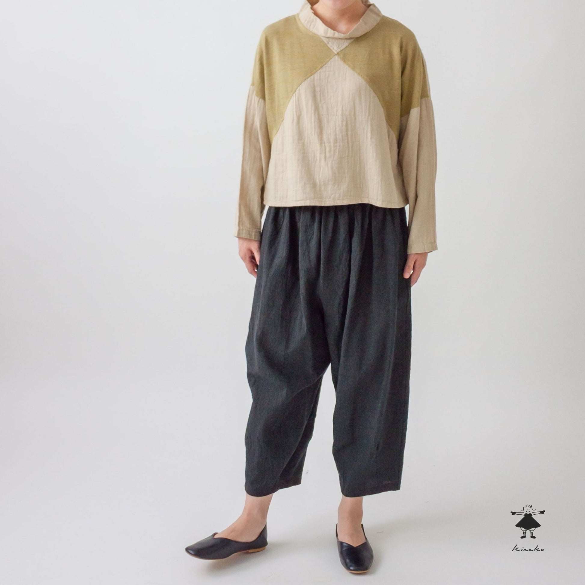前身頃を天竺と切り替えたショートプルオーバーです。製品染めによる切替部分の濃淡がポイントです。左裾にきなこちゃん刺しゅう有り。