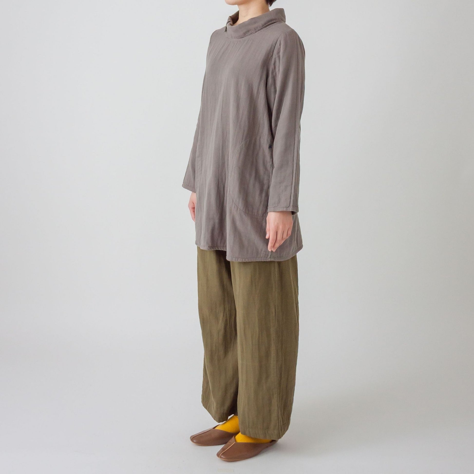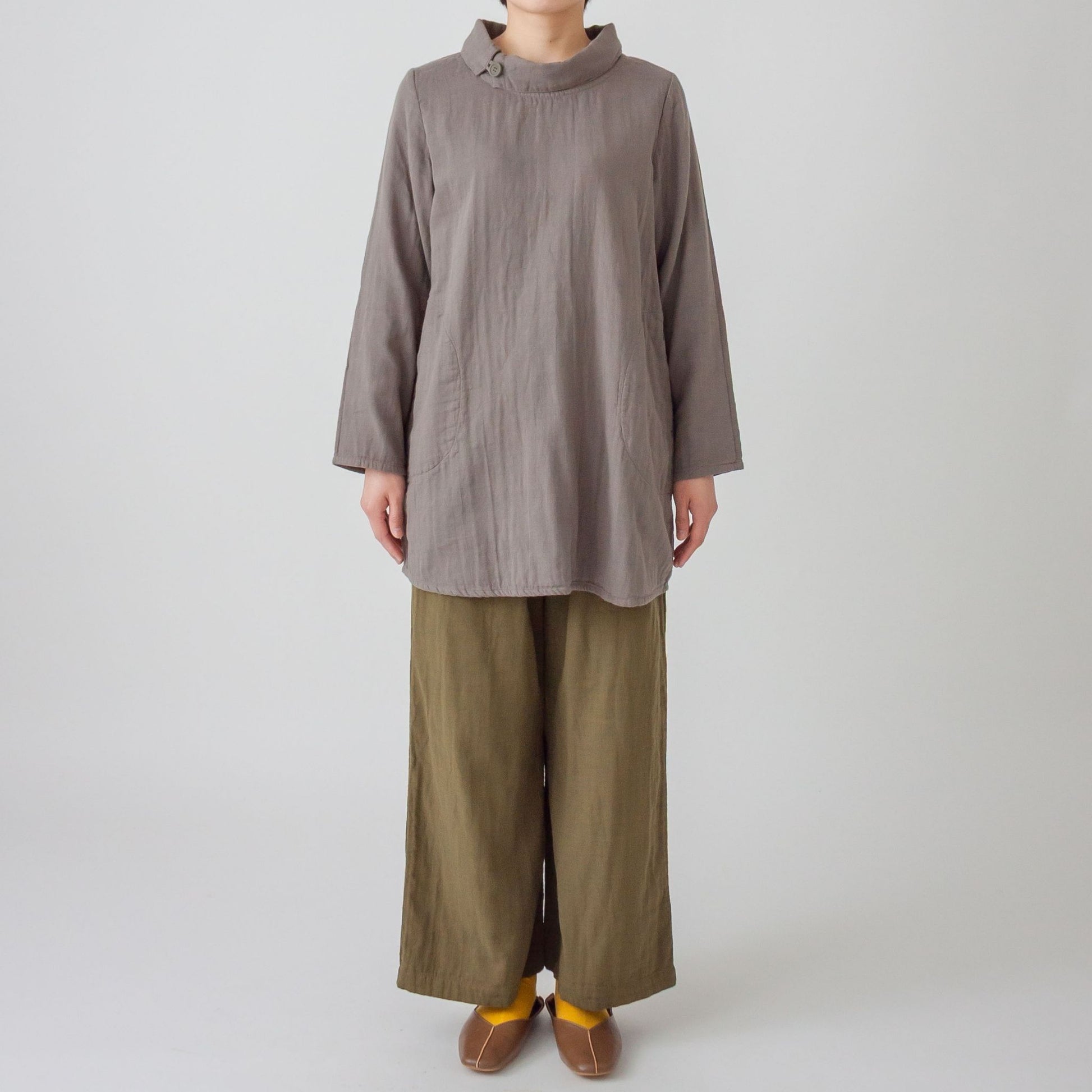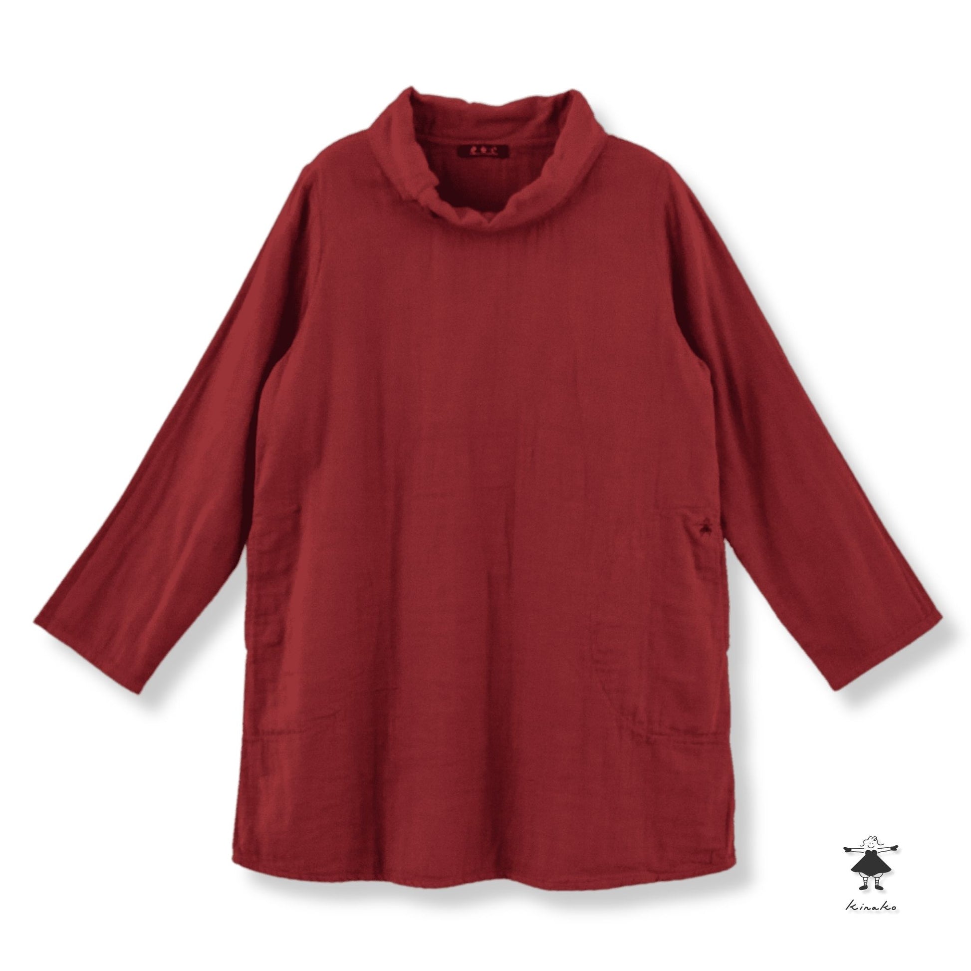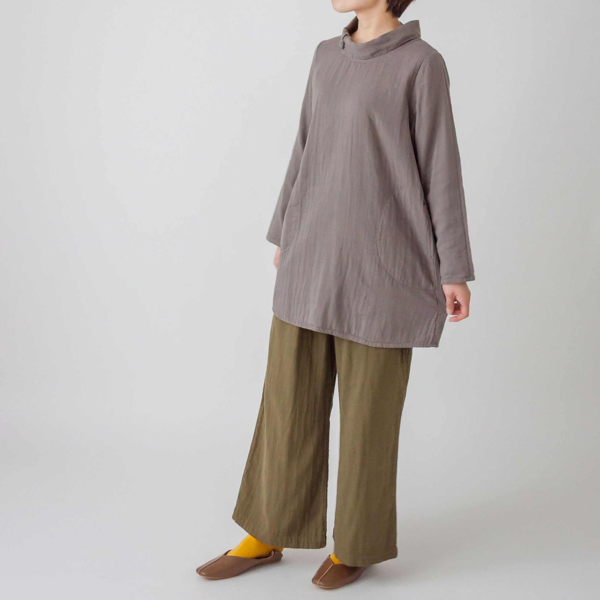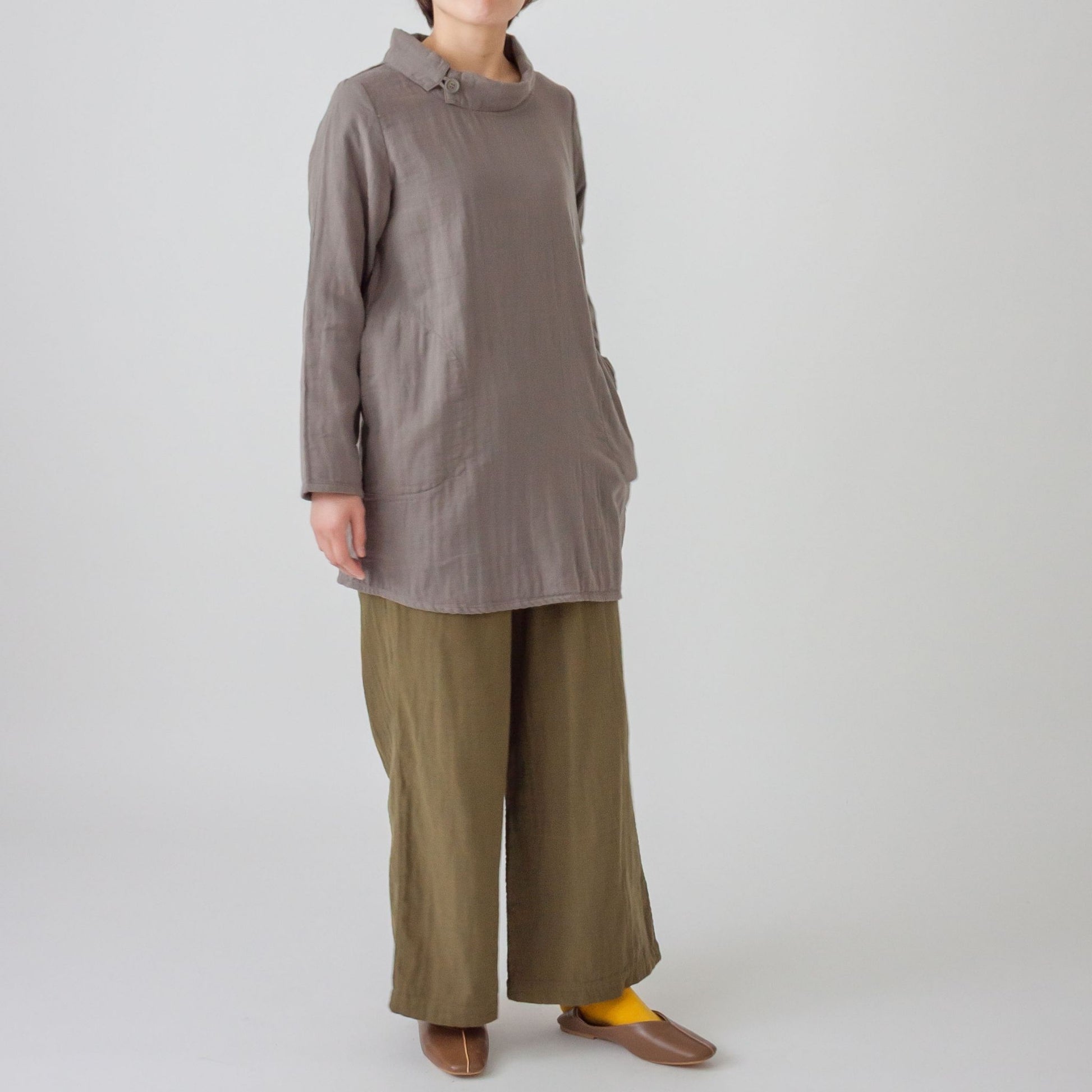 ハイネック風の衿に付けた大きめのボタンがポイントのチュニックです。ボタンを外して衿に変化を付けることができます。左ポケット口にきなこちゃん刺しゅう有り。