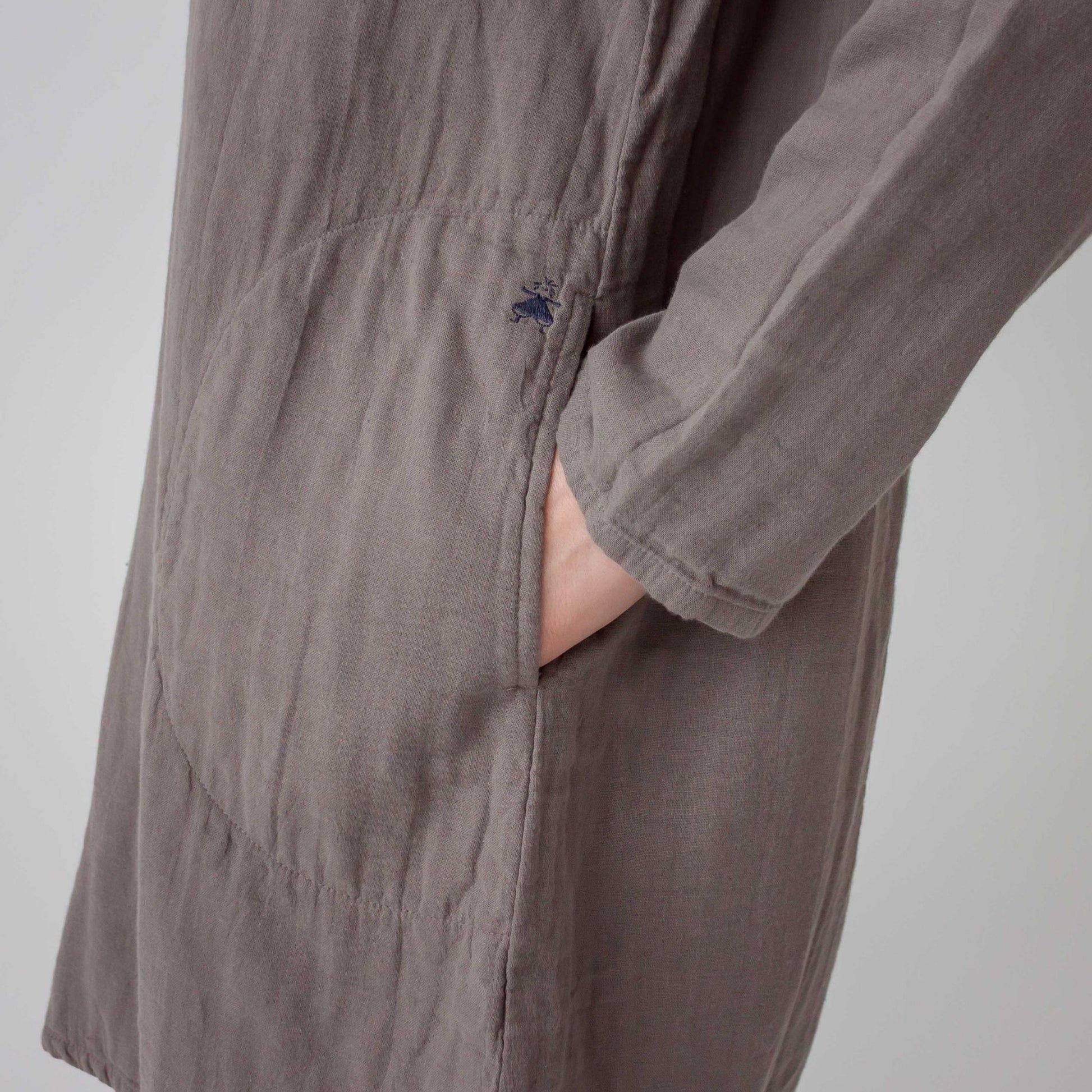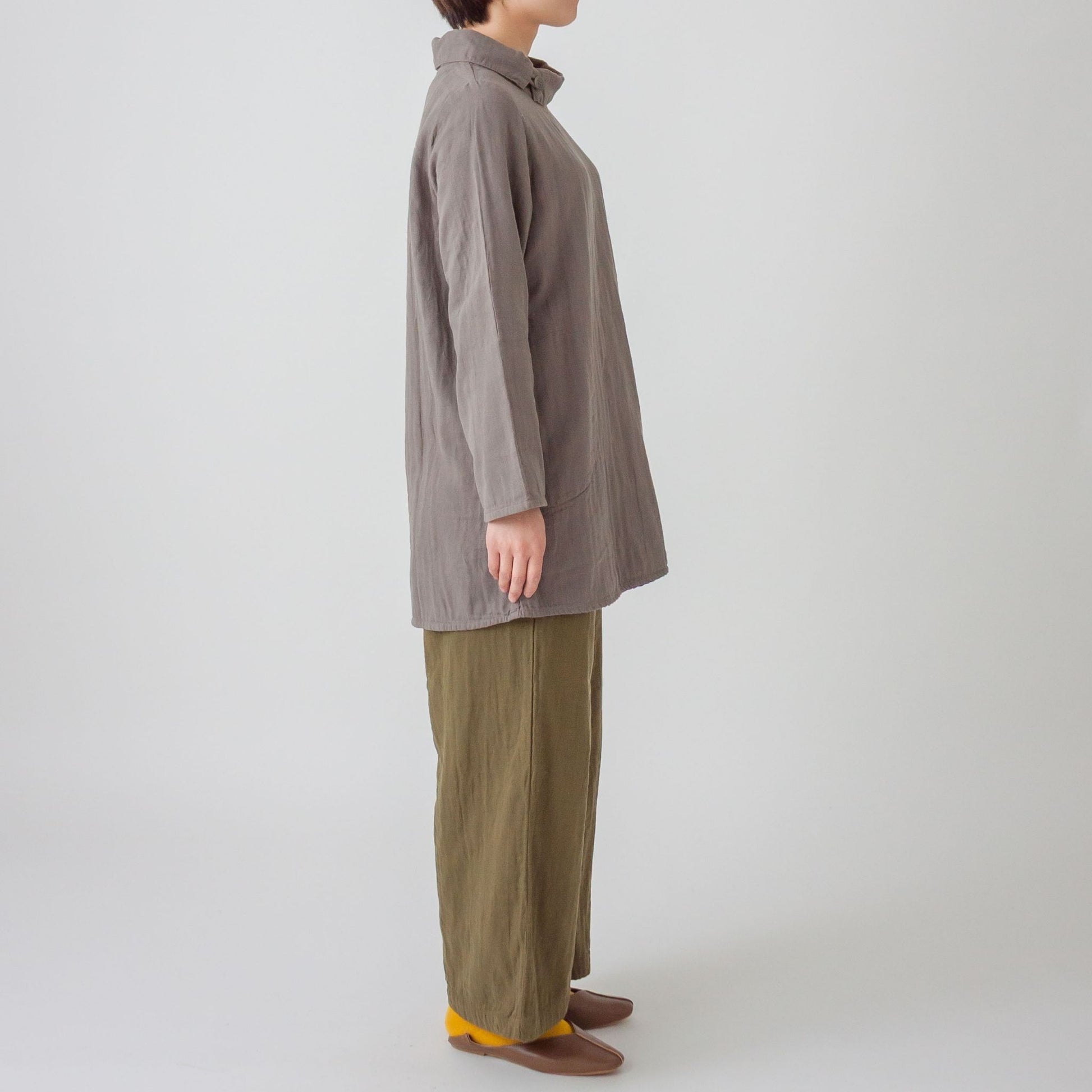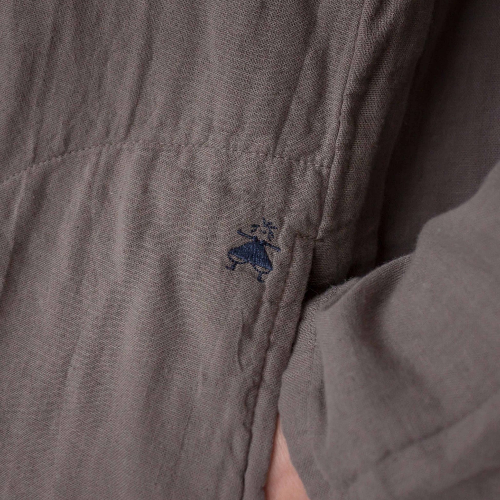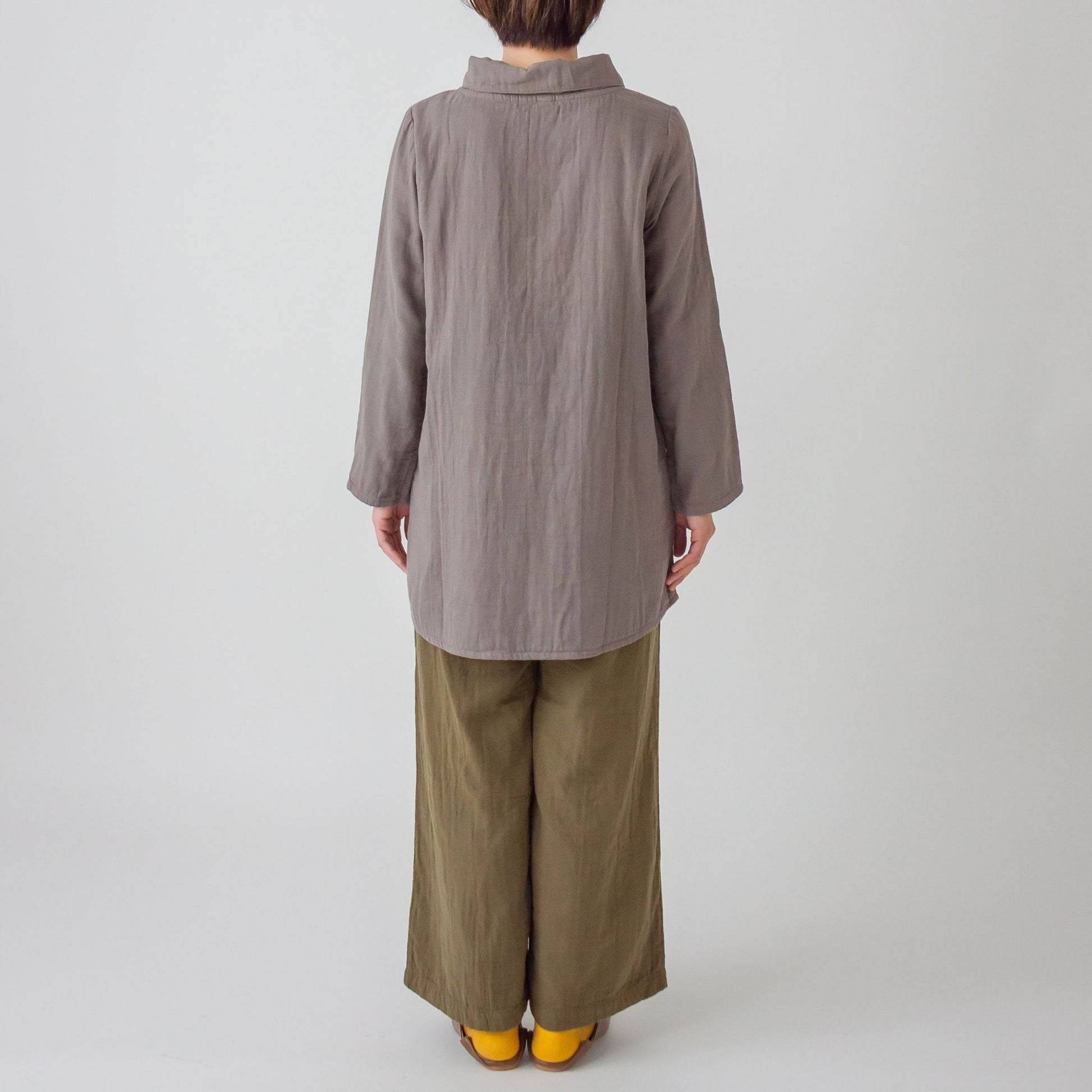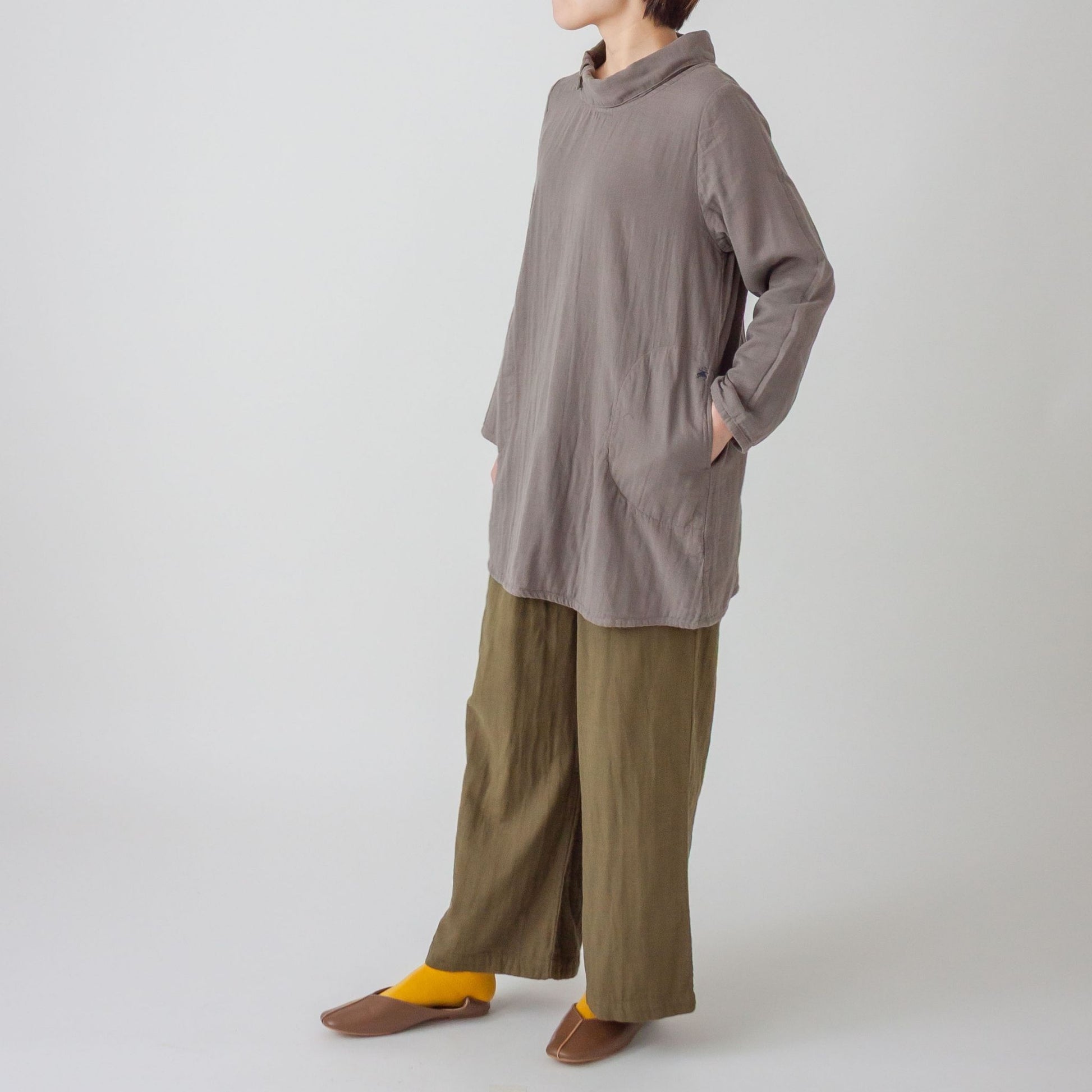 ハイネック風の衿に付けた大きめのボタンがポイントのチュニックです。ボタンを外して衿に変化を付けることができます。左ポケット口にきなこちゃん刺しゅう有り。
