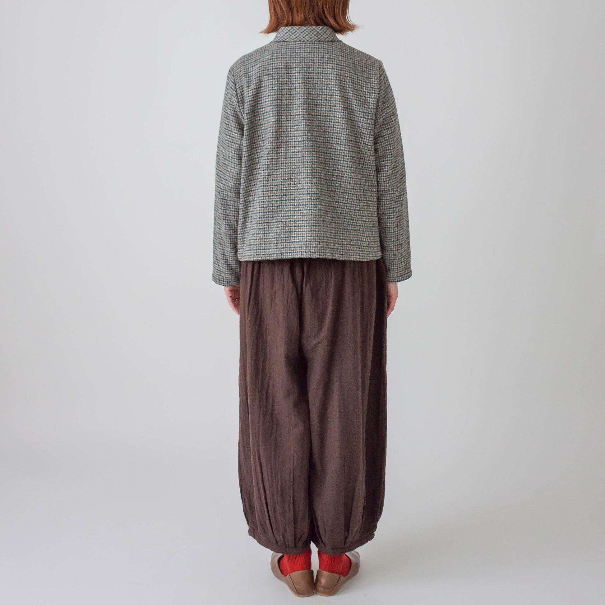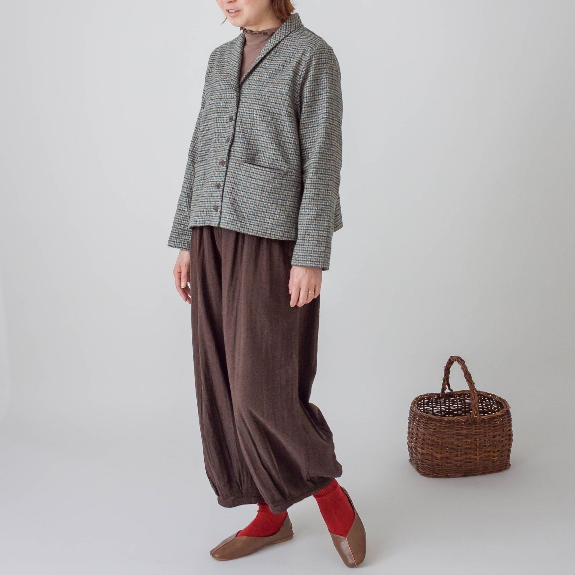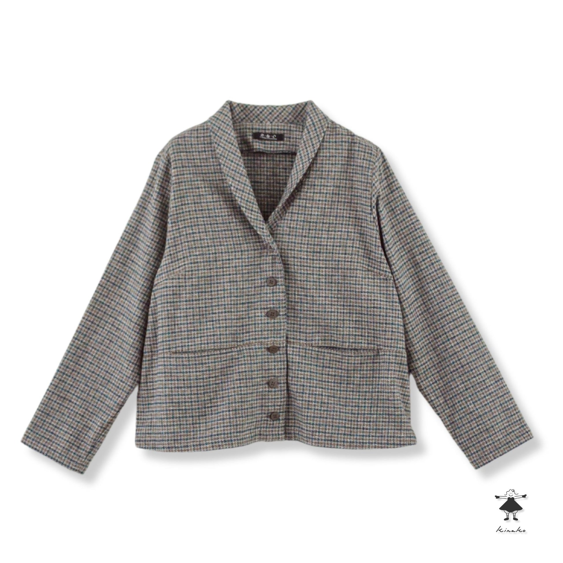 綿100%のツイード生地を使ったショート丈ジャケットです。スッキリしたショールカラーがポイントで、流行りのショート丈でコンパクトな見た目に仕上げました。