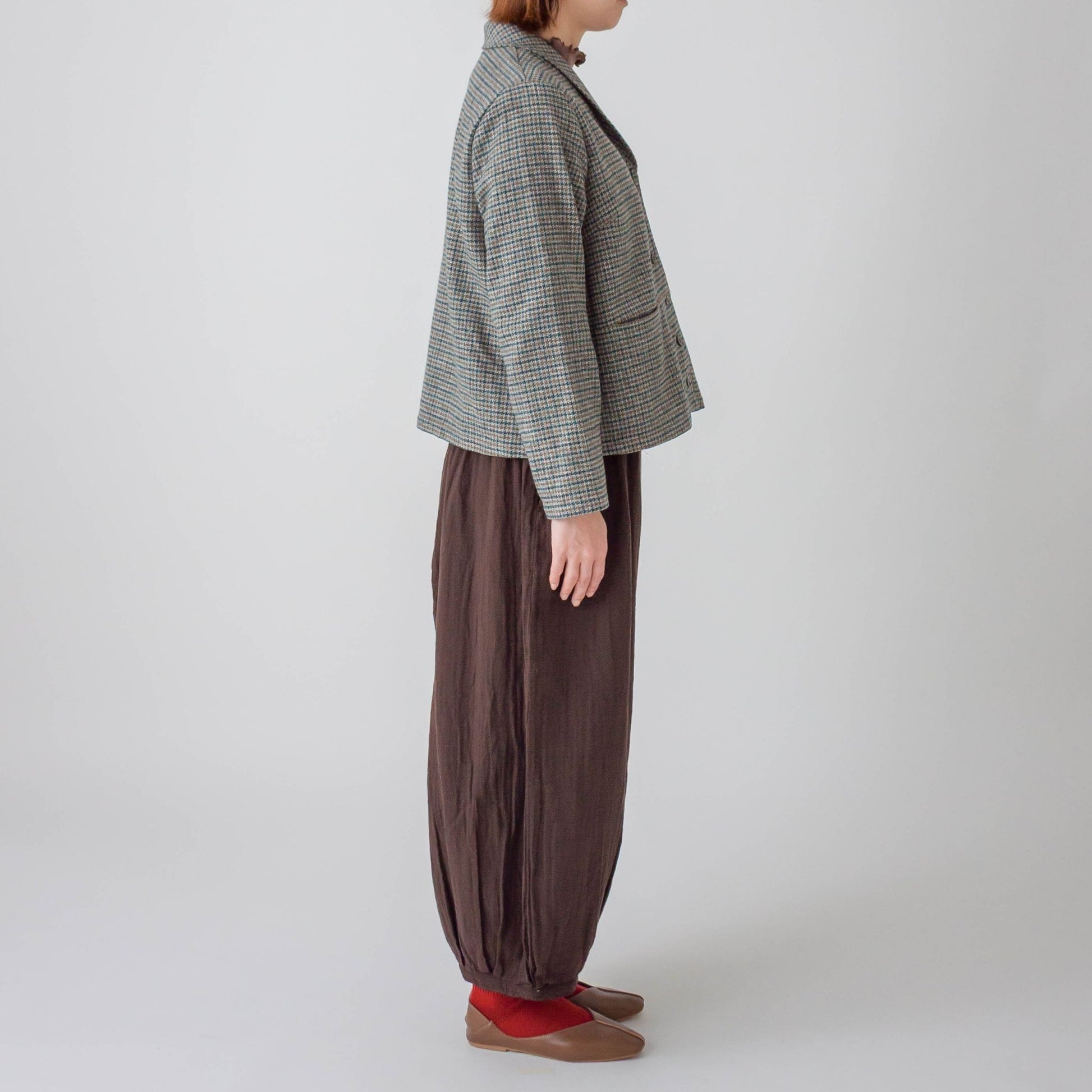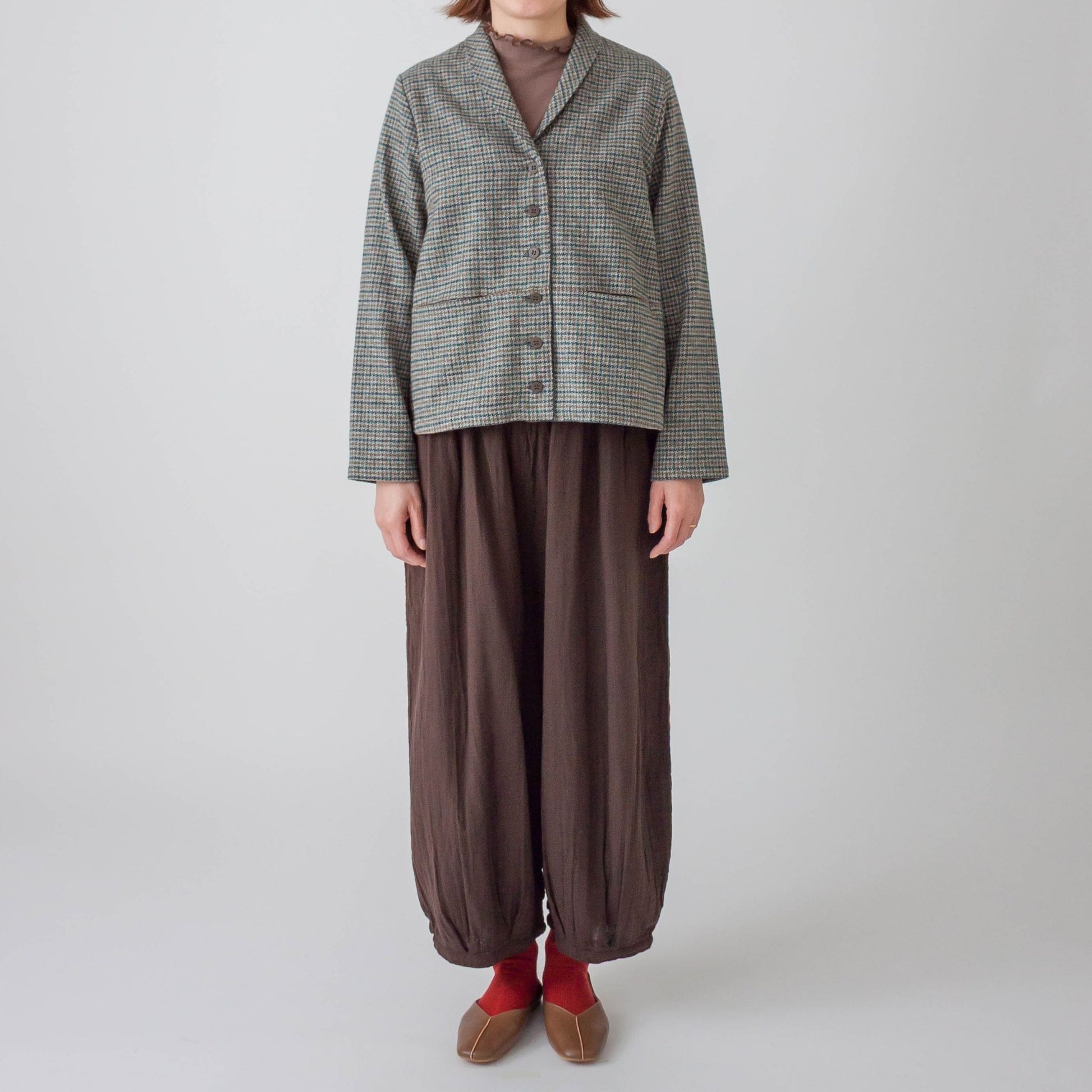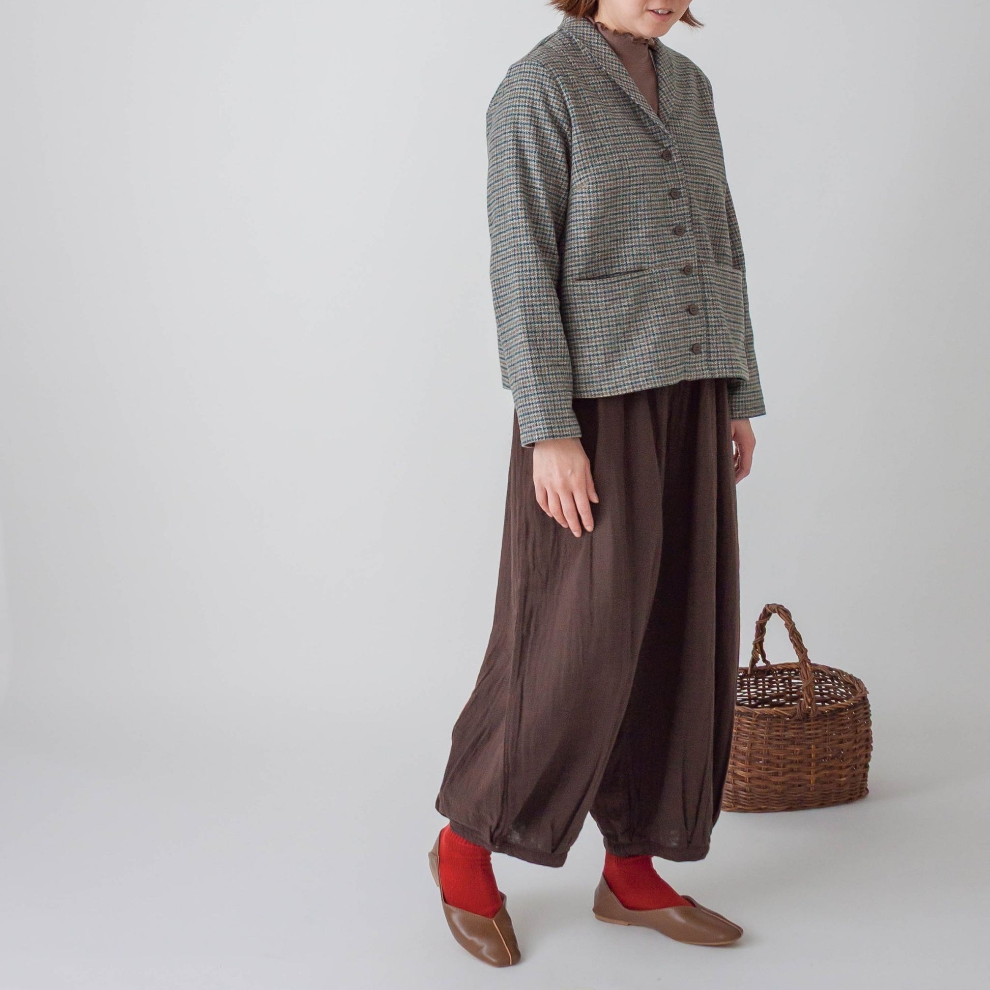 綿100%のツイード生地を使ったショート丈ジャケットです。スッキリしたショールカラーがポイントで、流行りのショート丈でコンパクトな見た目に仕上げました。