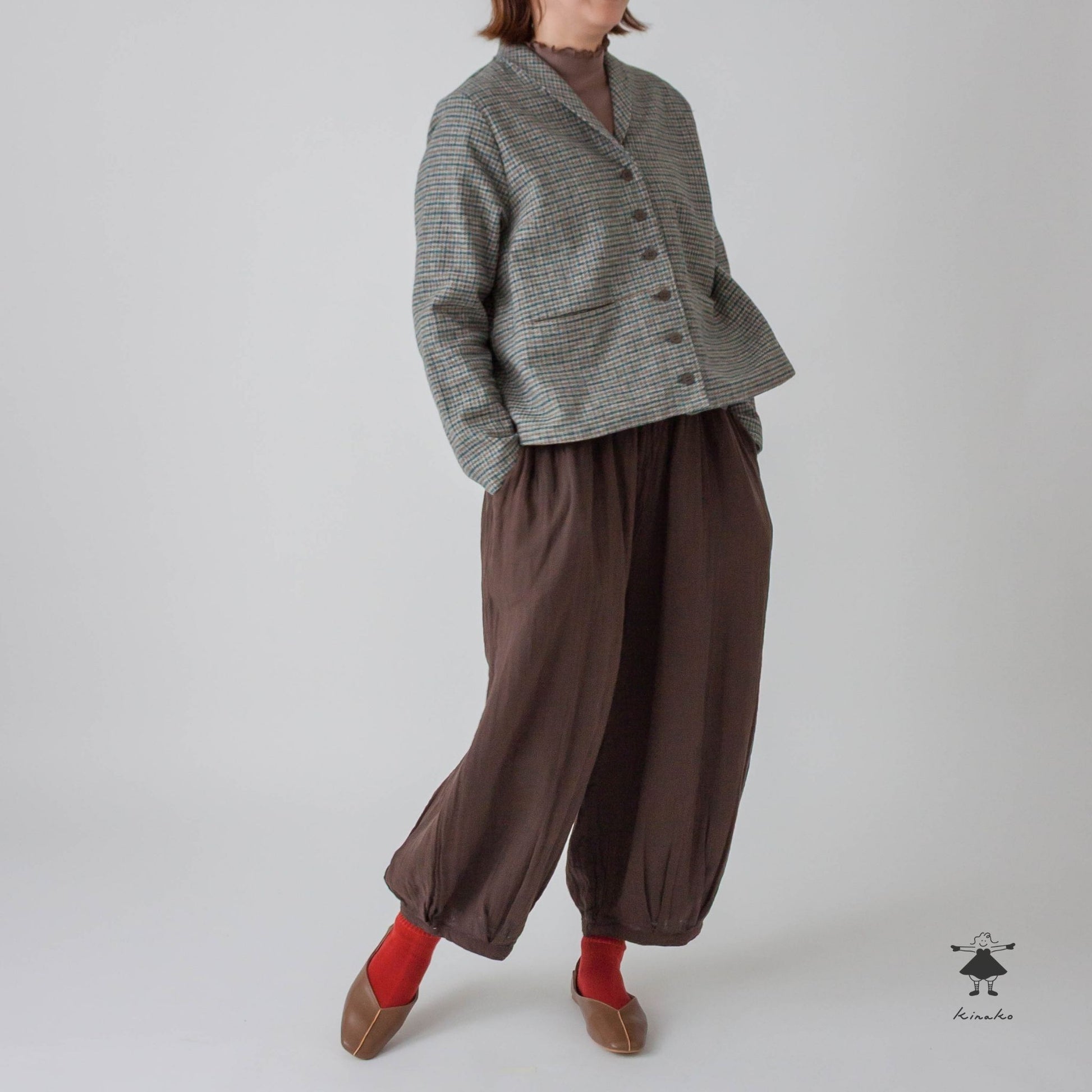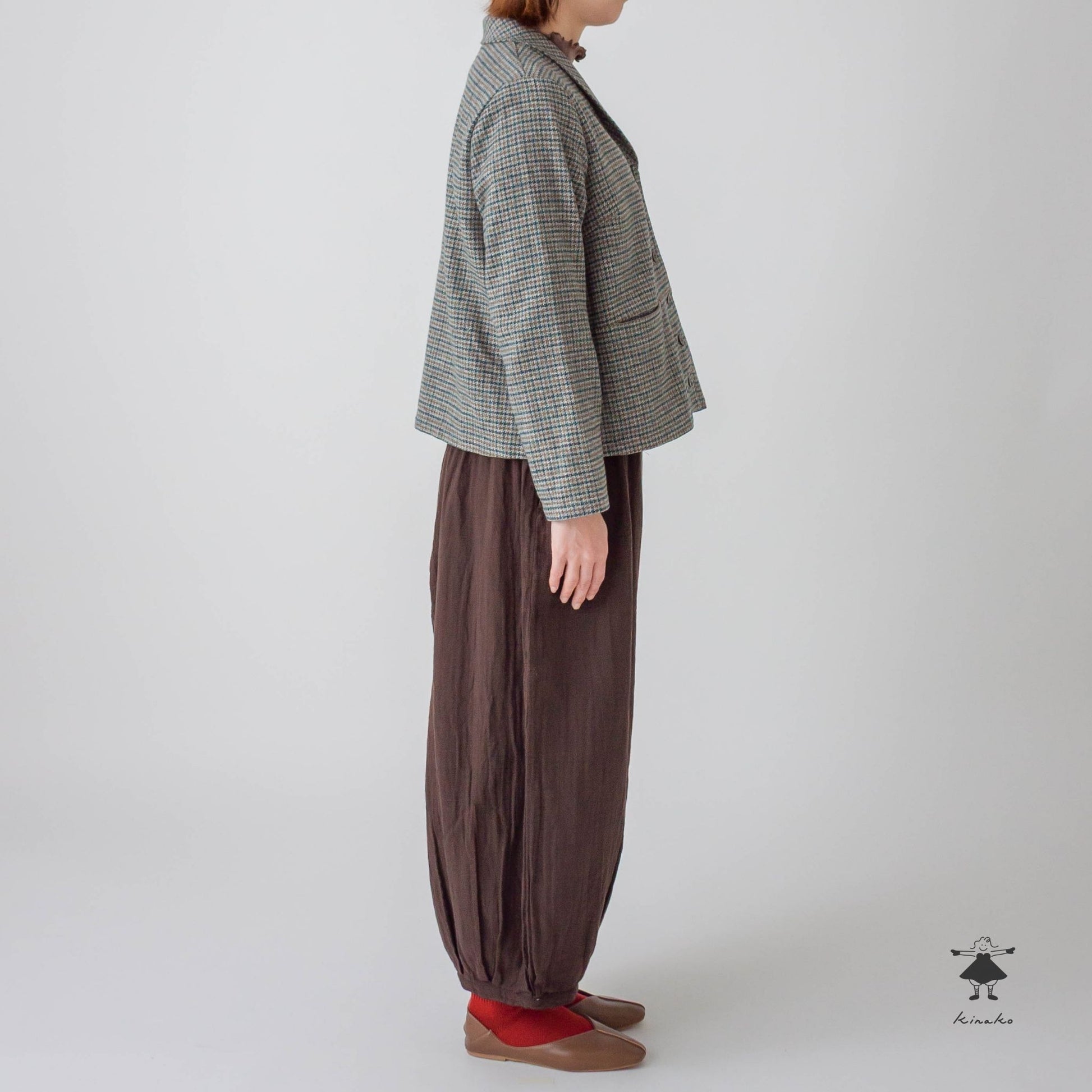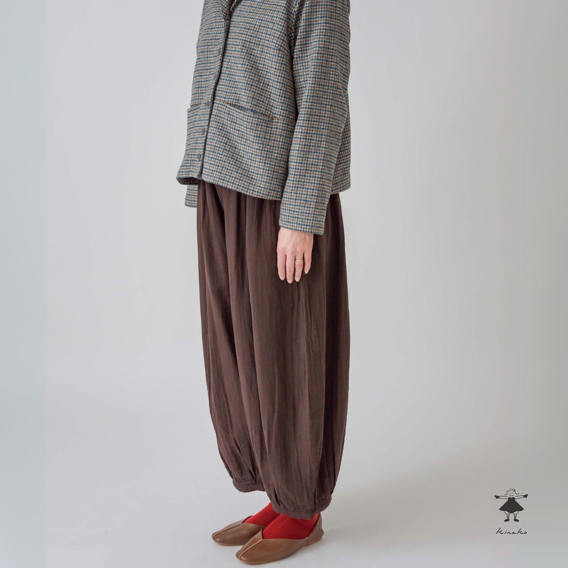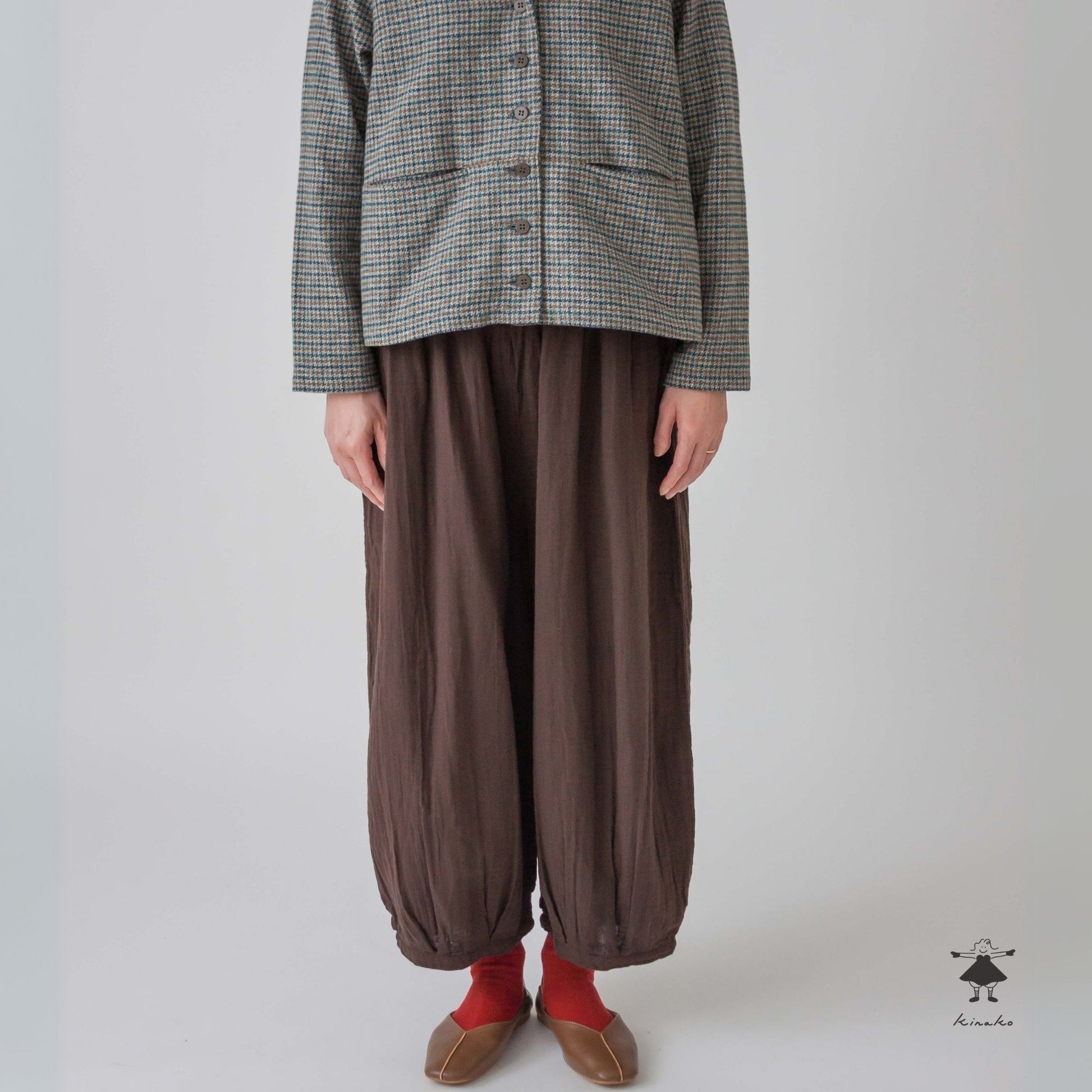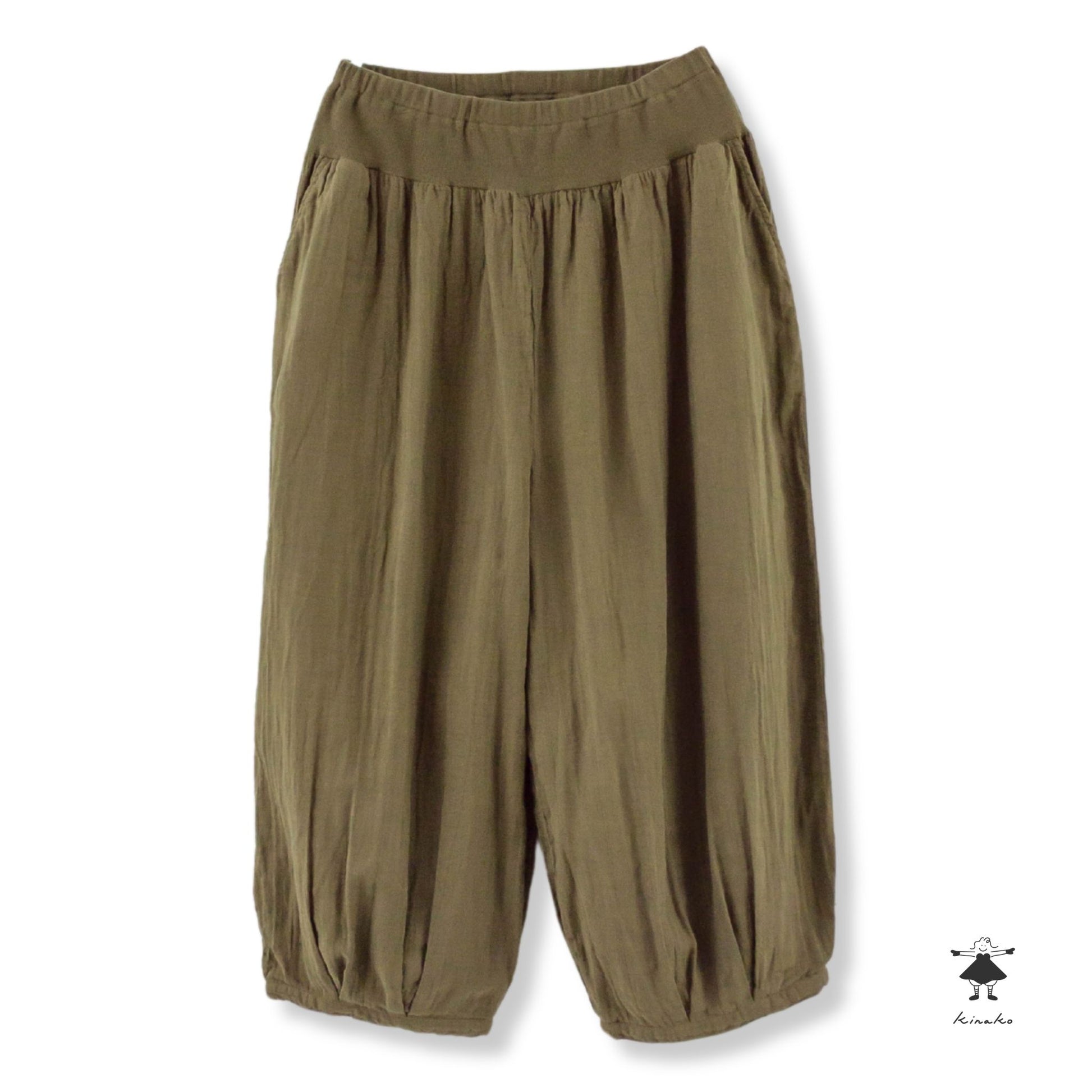 ガーゼ生地をたっぷり使ったバルーン型パンツです。ウエスト部分はテレコ生地を使いスッキリした見た目とお腹を包むような優しい履き心地が特徴です。裾口にタックを入れて丸いシルエットに仕上げました。