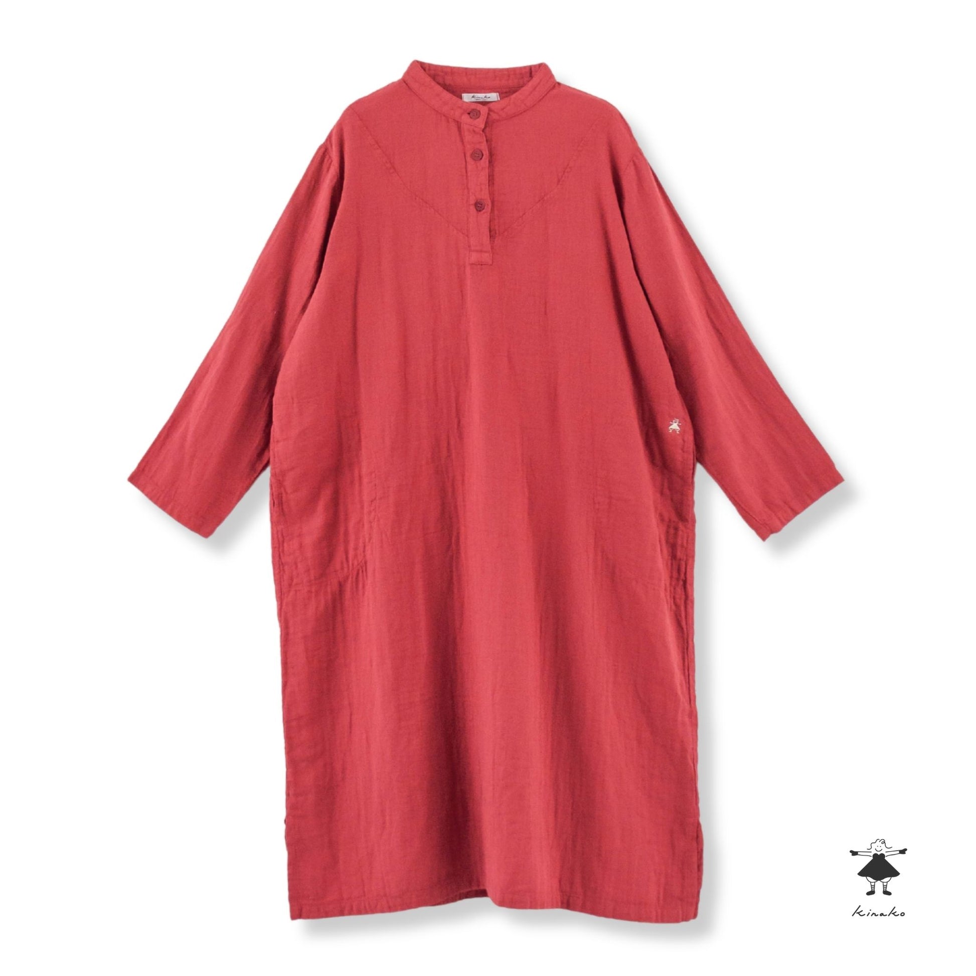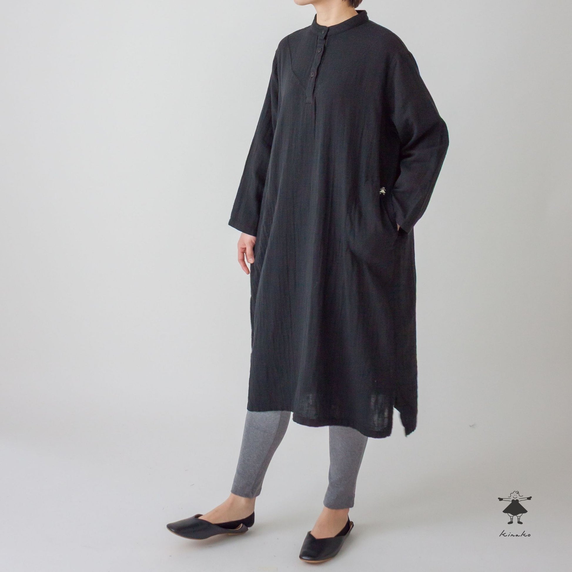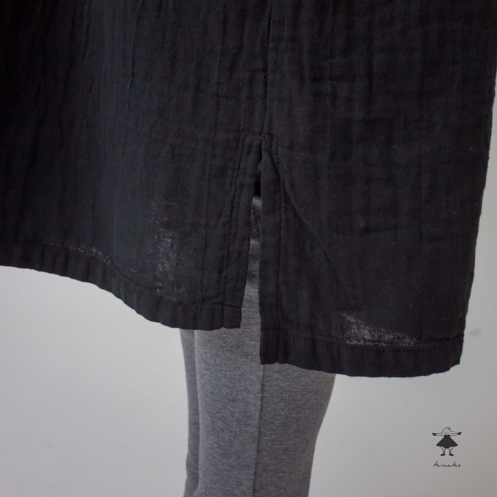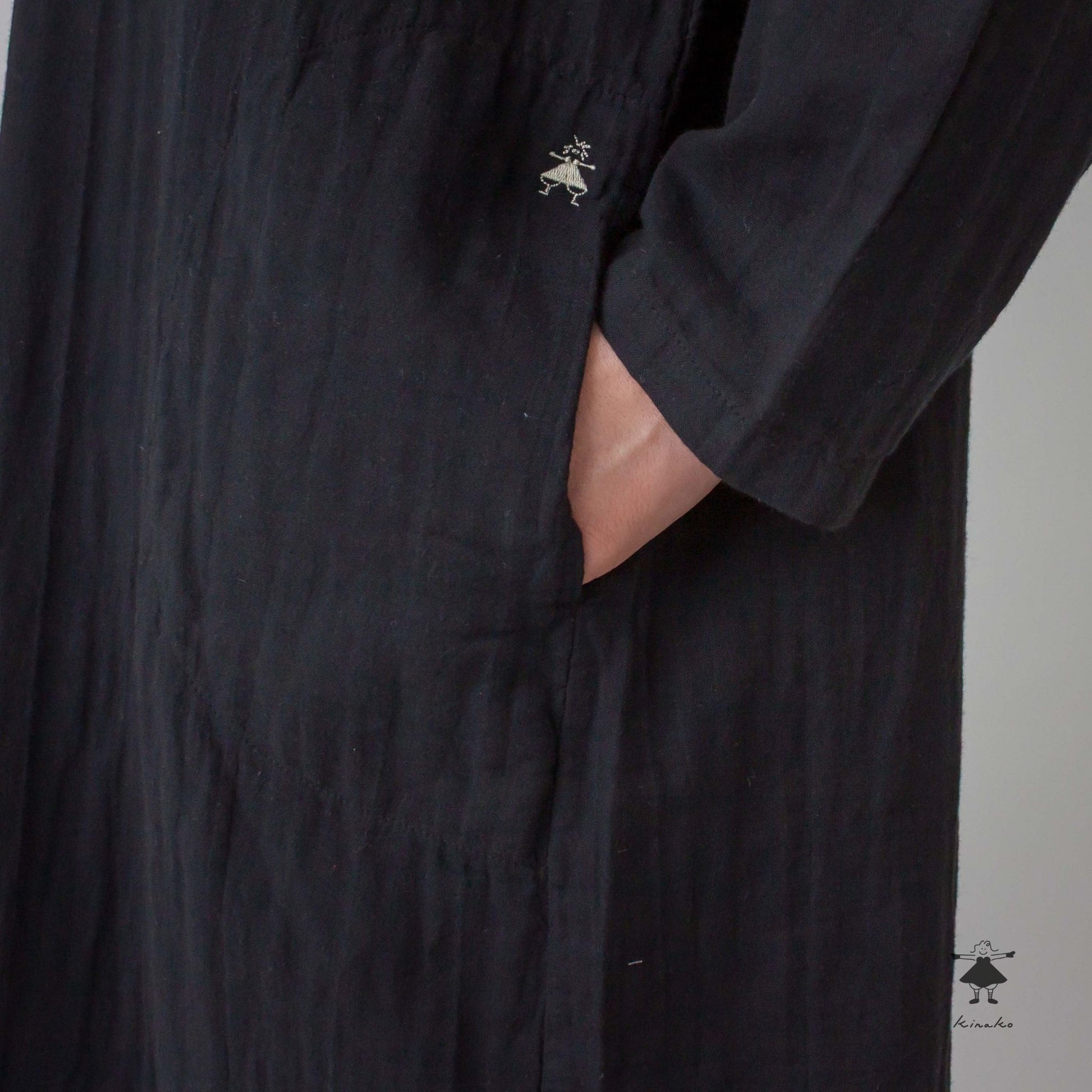 ゆったりとした身幅と広がりを抑えたストレートシルエットが特徴のワンピースです。首元のVライン切替えがスッキリとした印象です。左ポケット口にきなこちゃん刺しゅう有り。