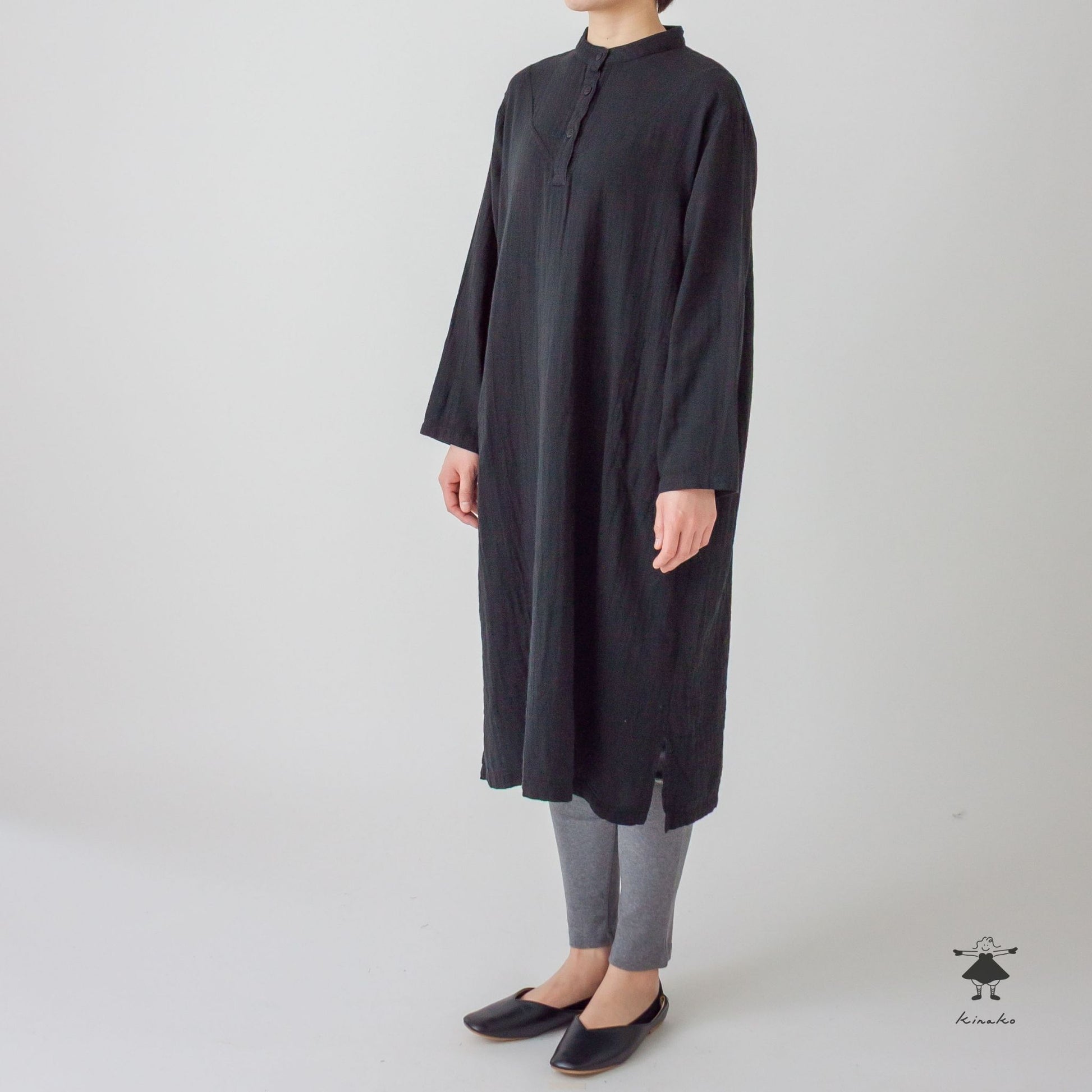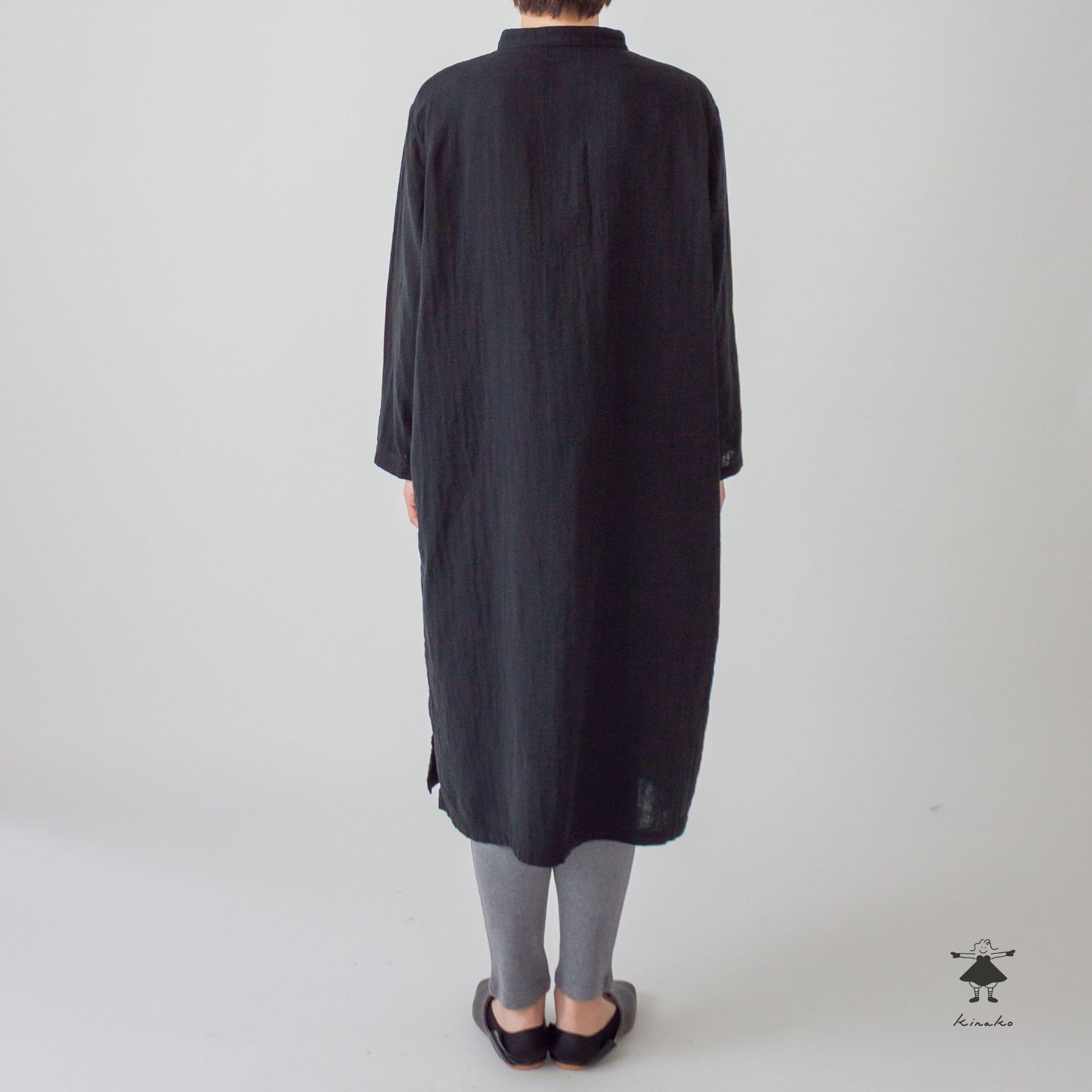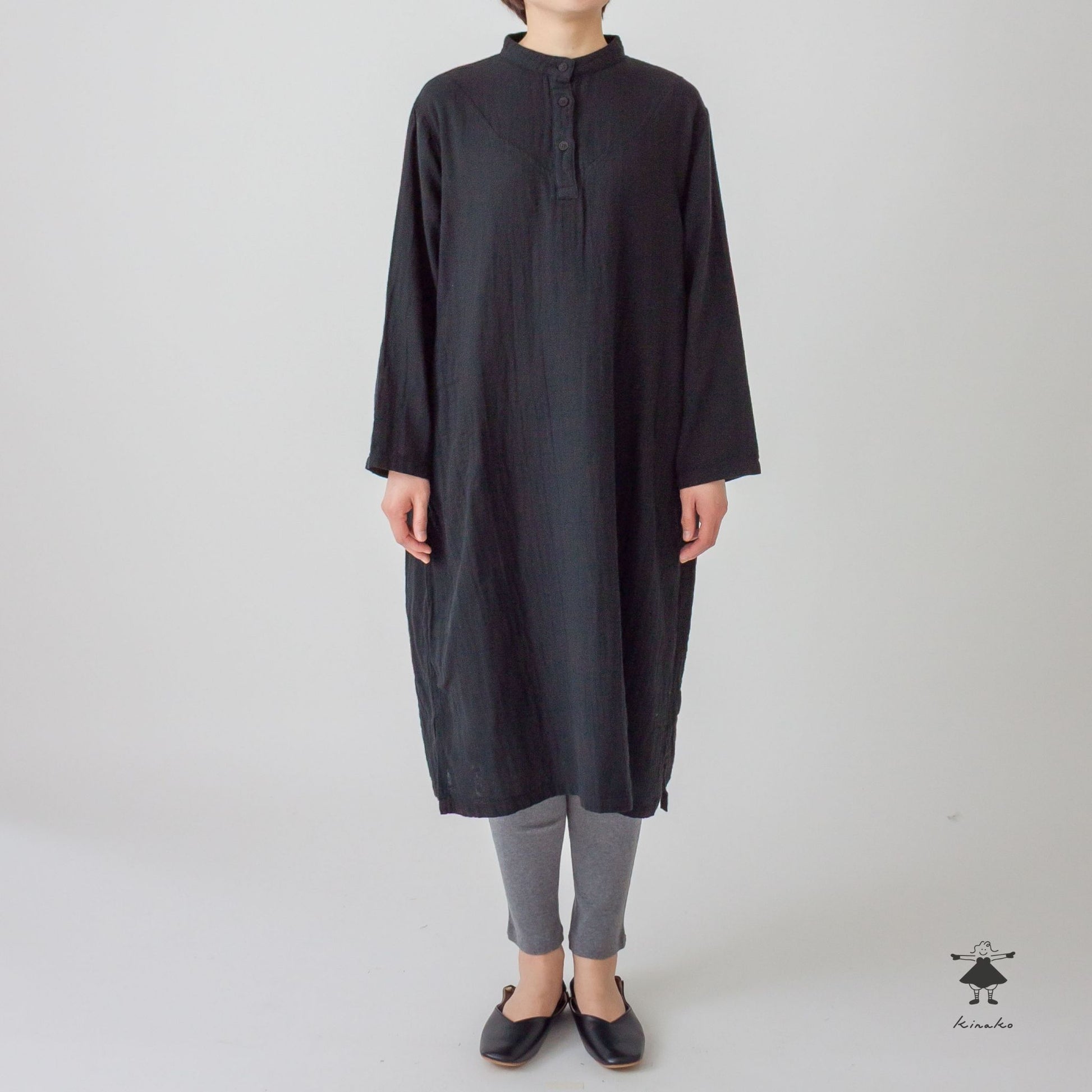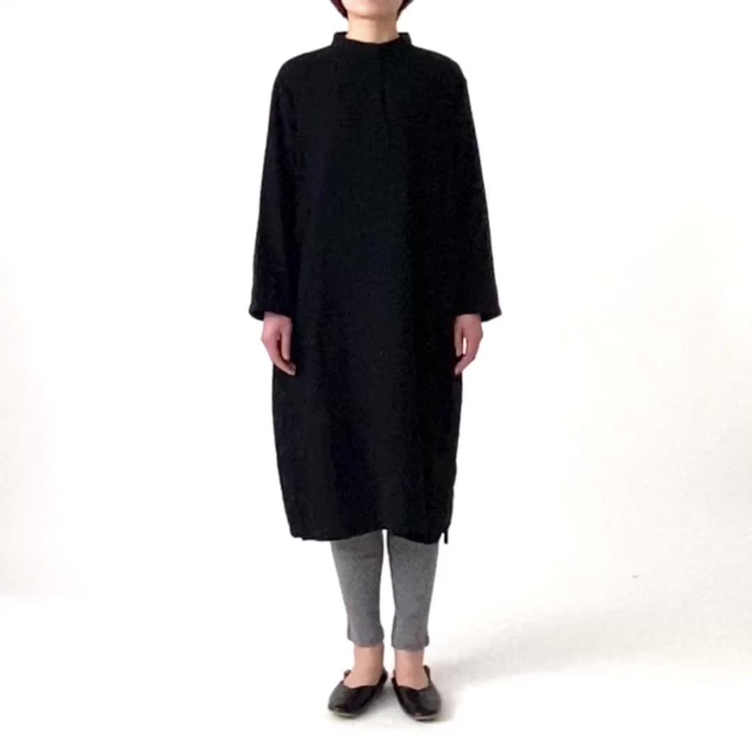 ゆったりとした身幅と広がりを抑えたストレートシルエットが特徴のワンピースです。首元のVライン切替えがスッキリとした印象です。左ポケット口にきなこちゃん刺しゅう有り。