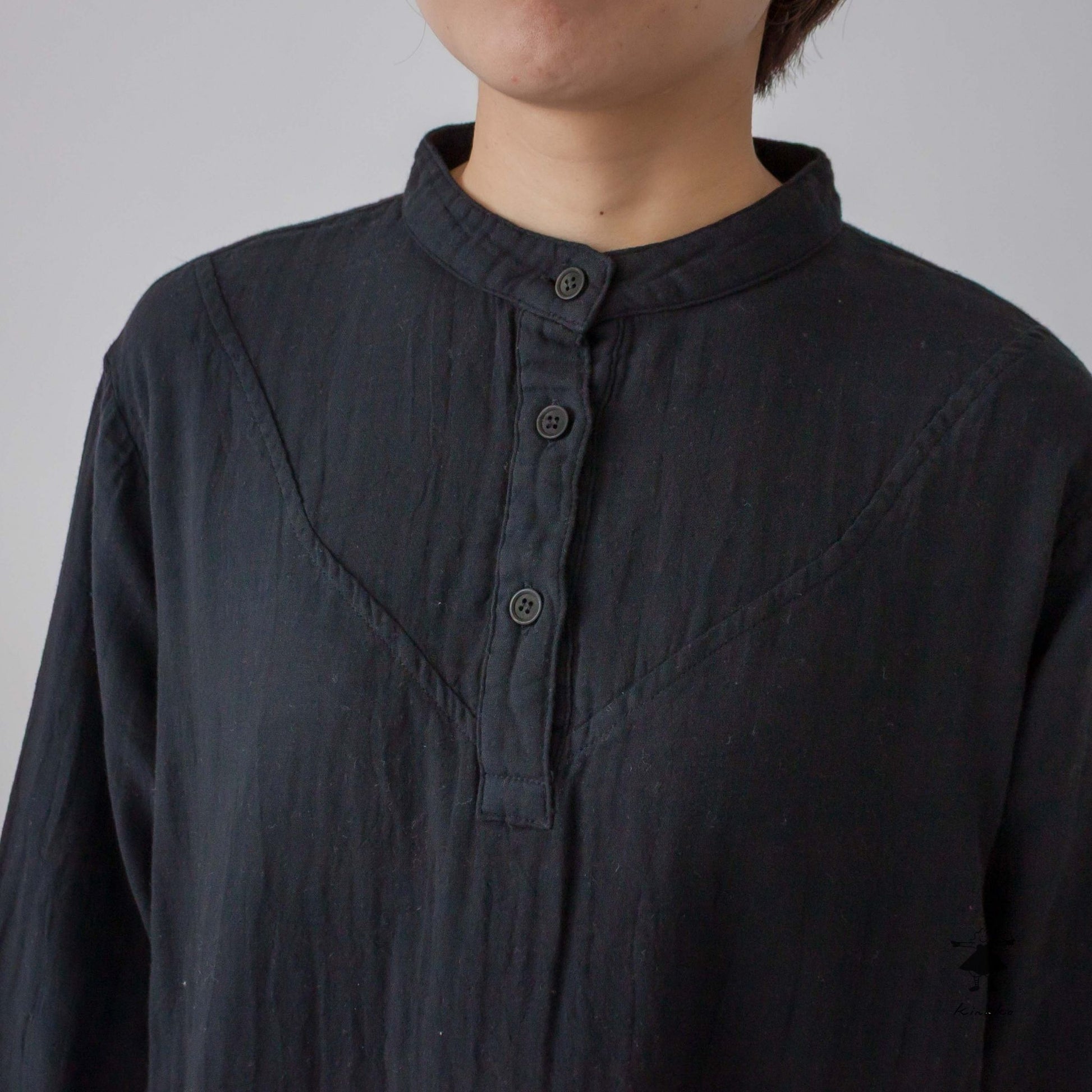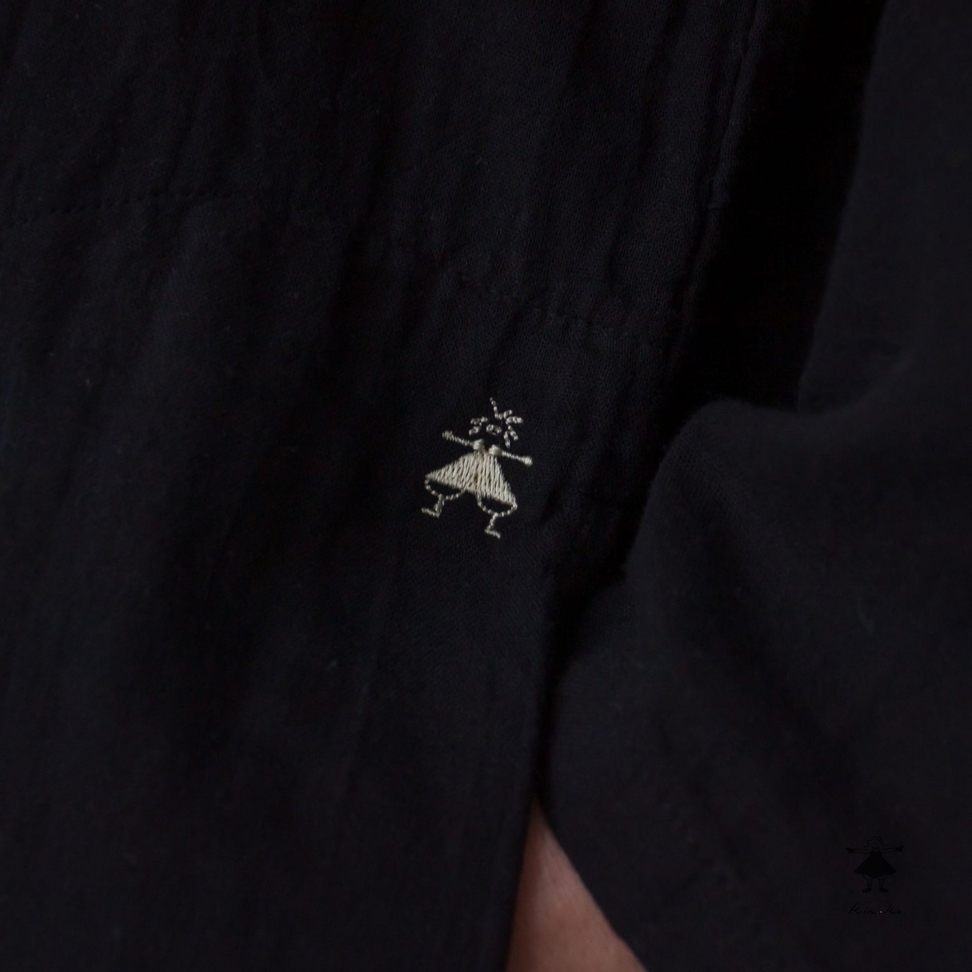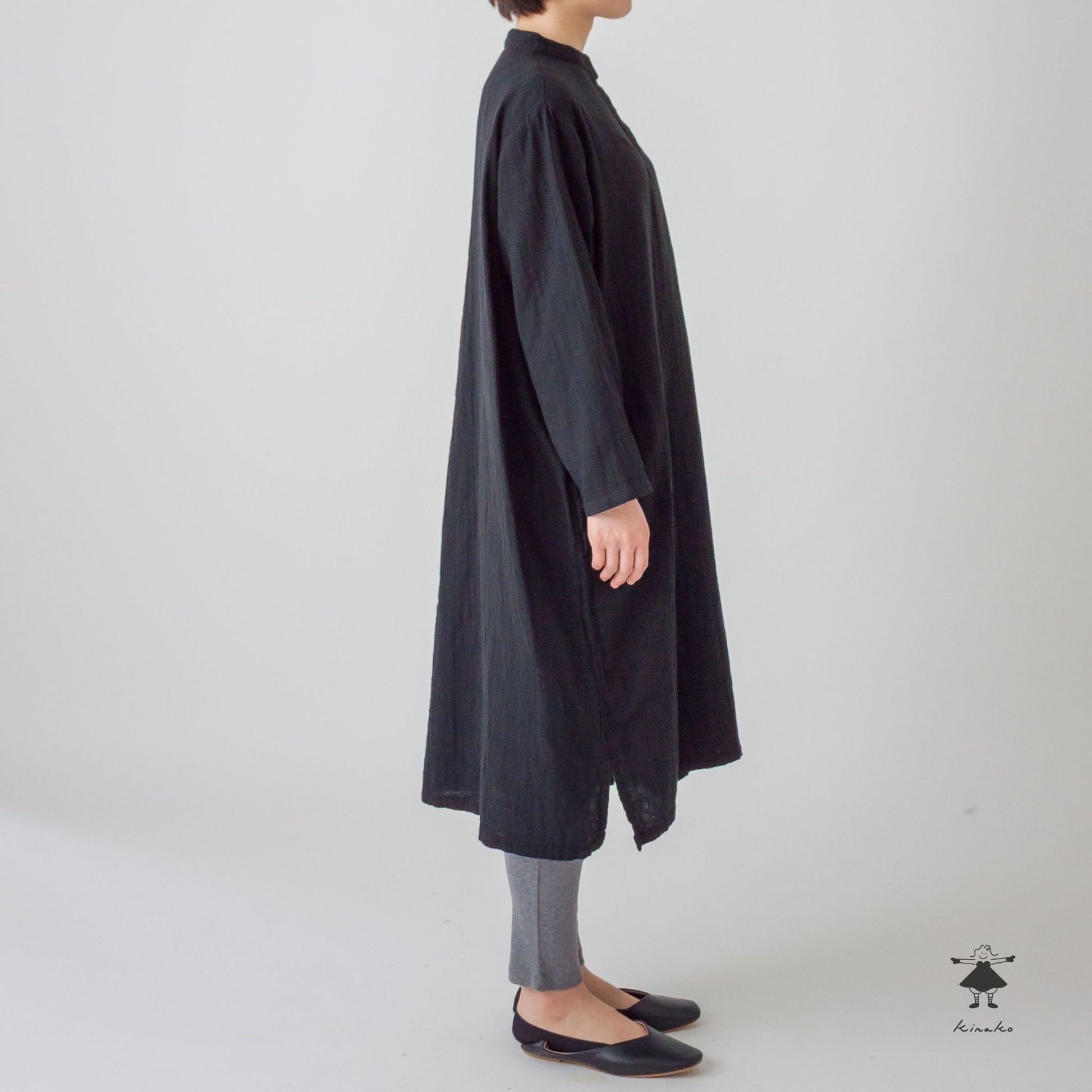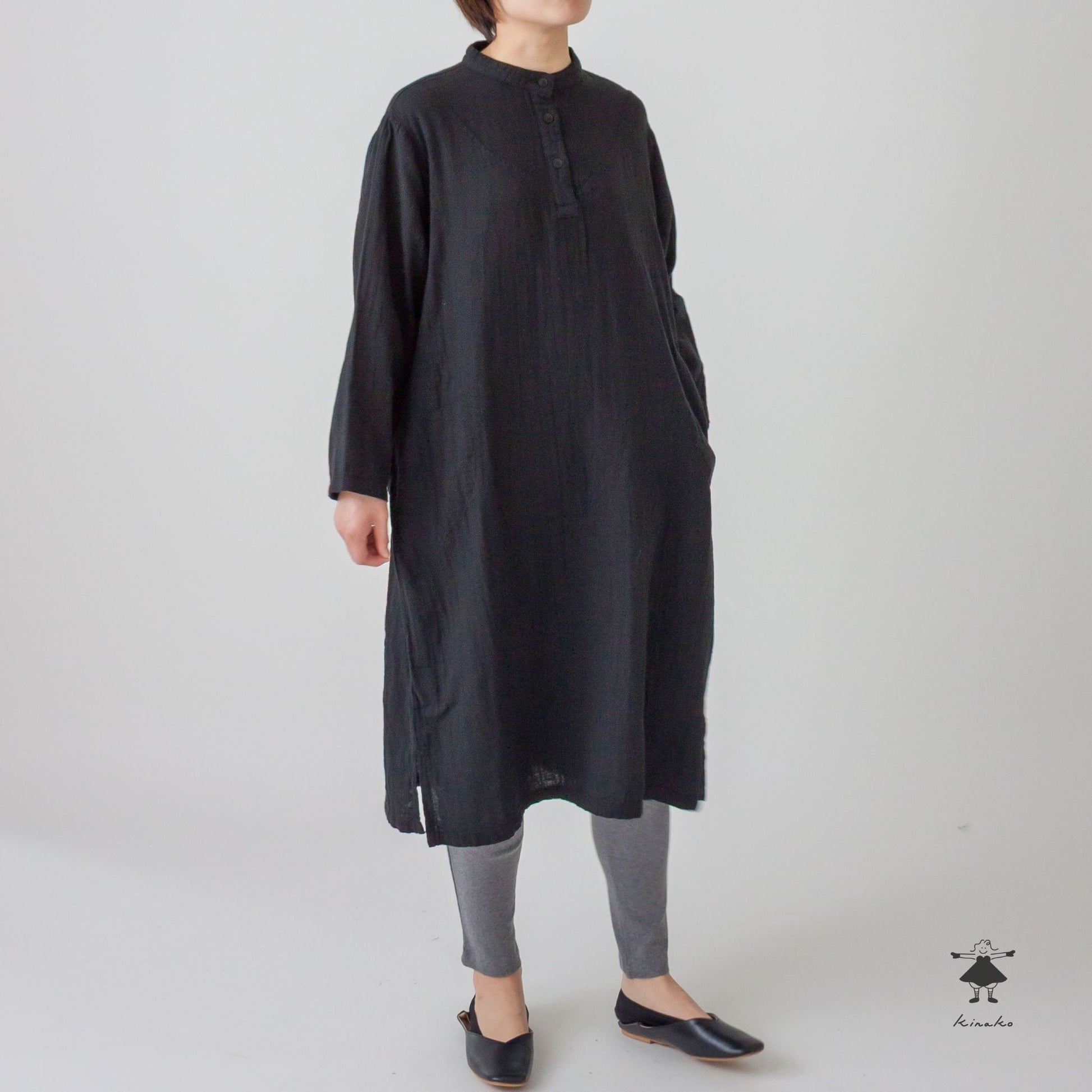 ゆったりとした身幅と広がりを抑えたストレートシルエットが特徴のワンピースです。首元のVライン切替えがスッキリとした印象です。左ポケット口にきなこちゃん刺しゅう有り。