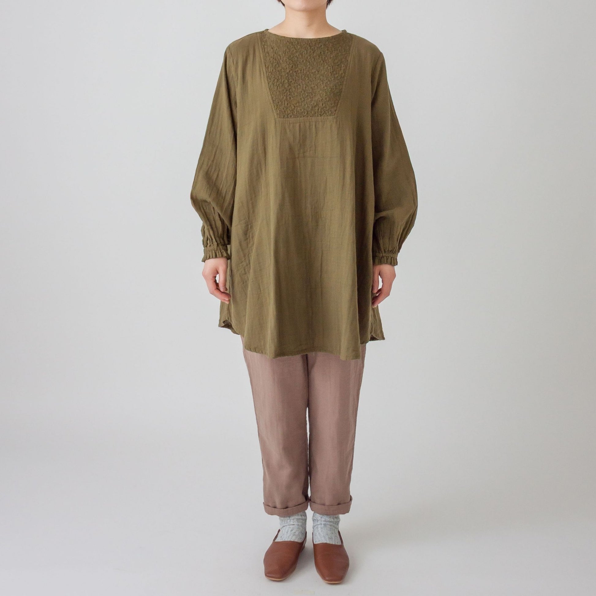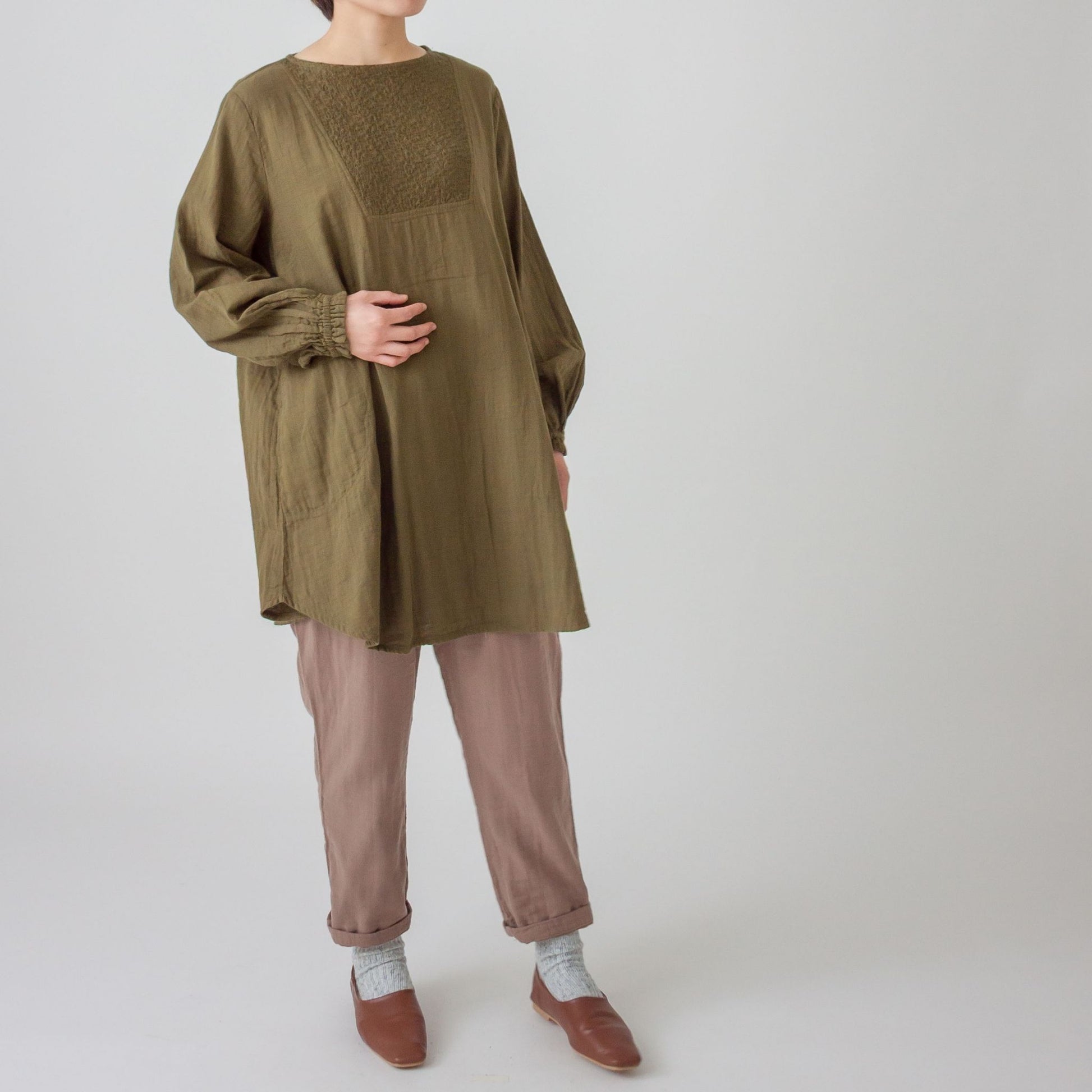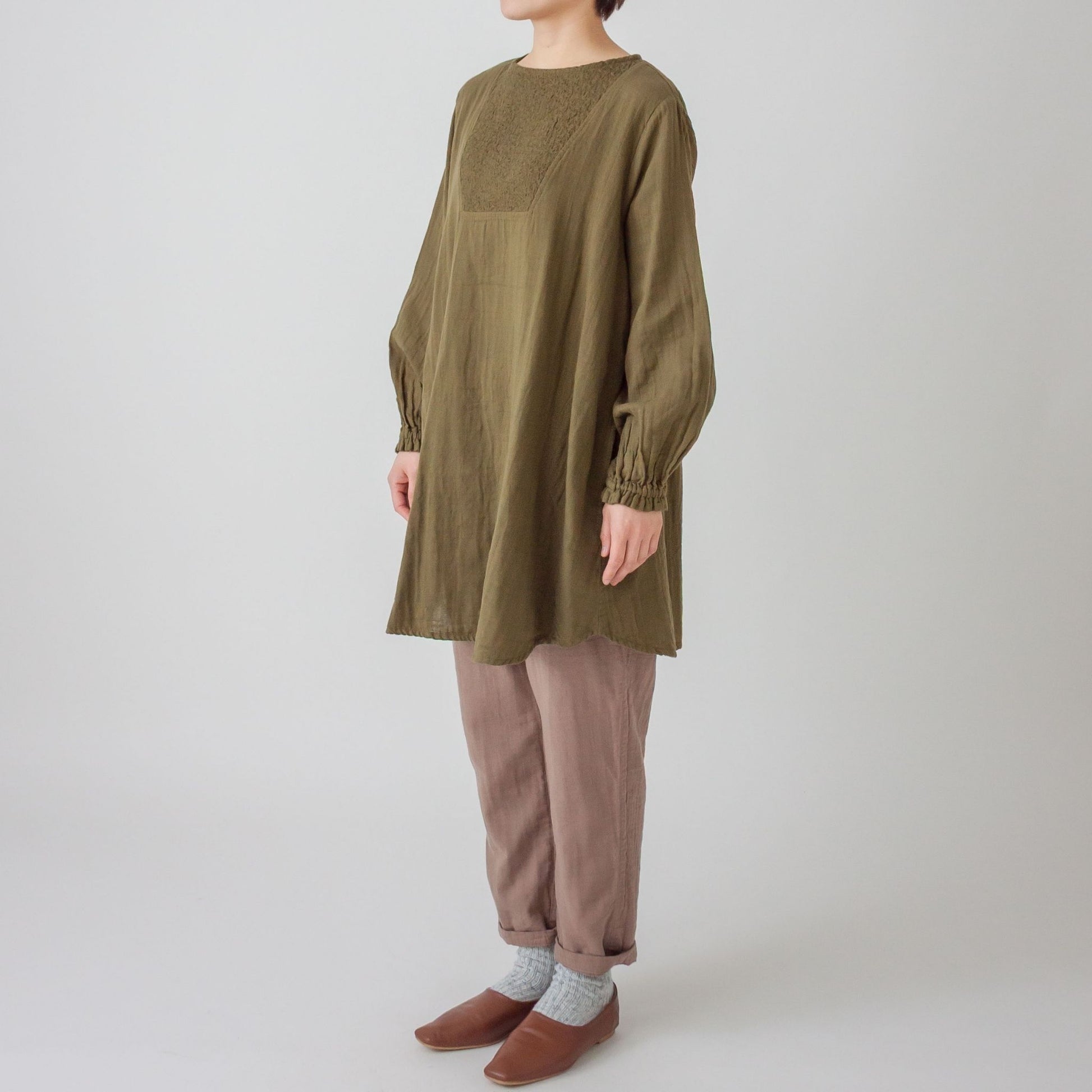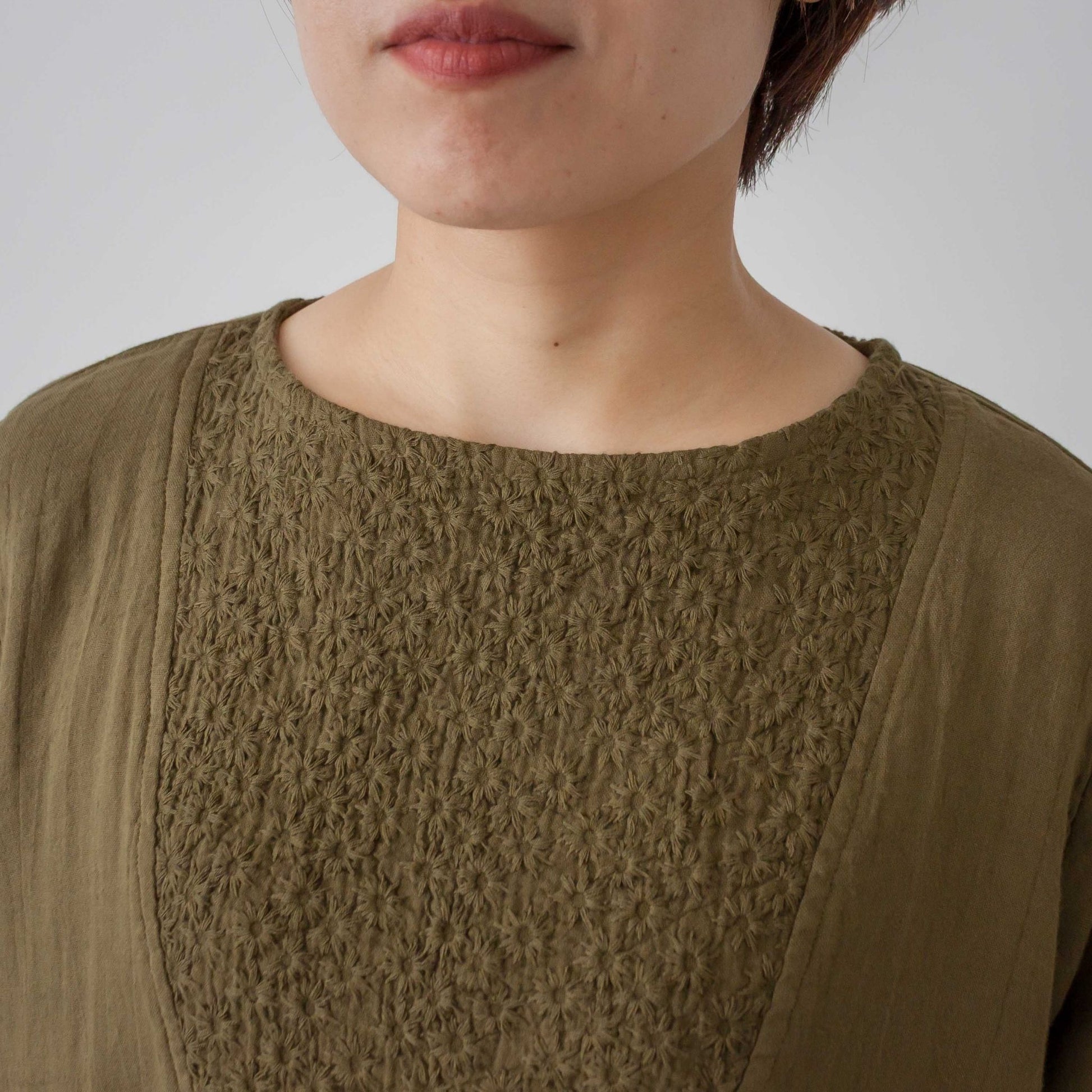 胸元の切替部分に花柄刺しゅう生地を使ったチュニックです。ゆったりしたサイズ感で着やすく、衿開きを抑えつつ脱ぎ着が楽な様に衿後ろにゴムを入れています。