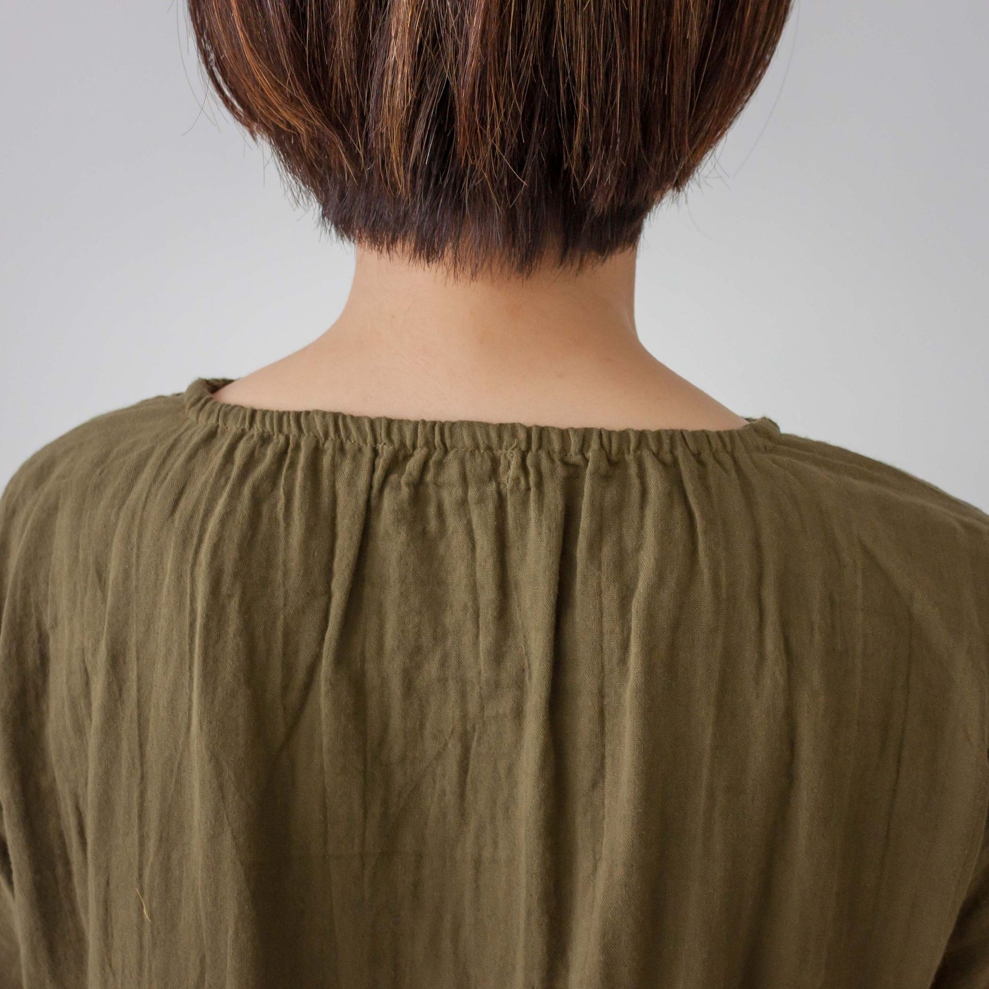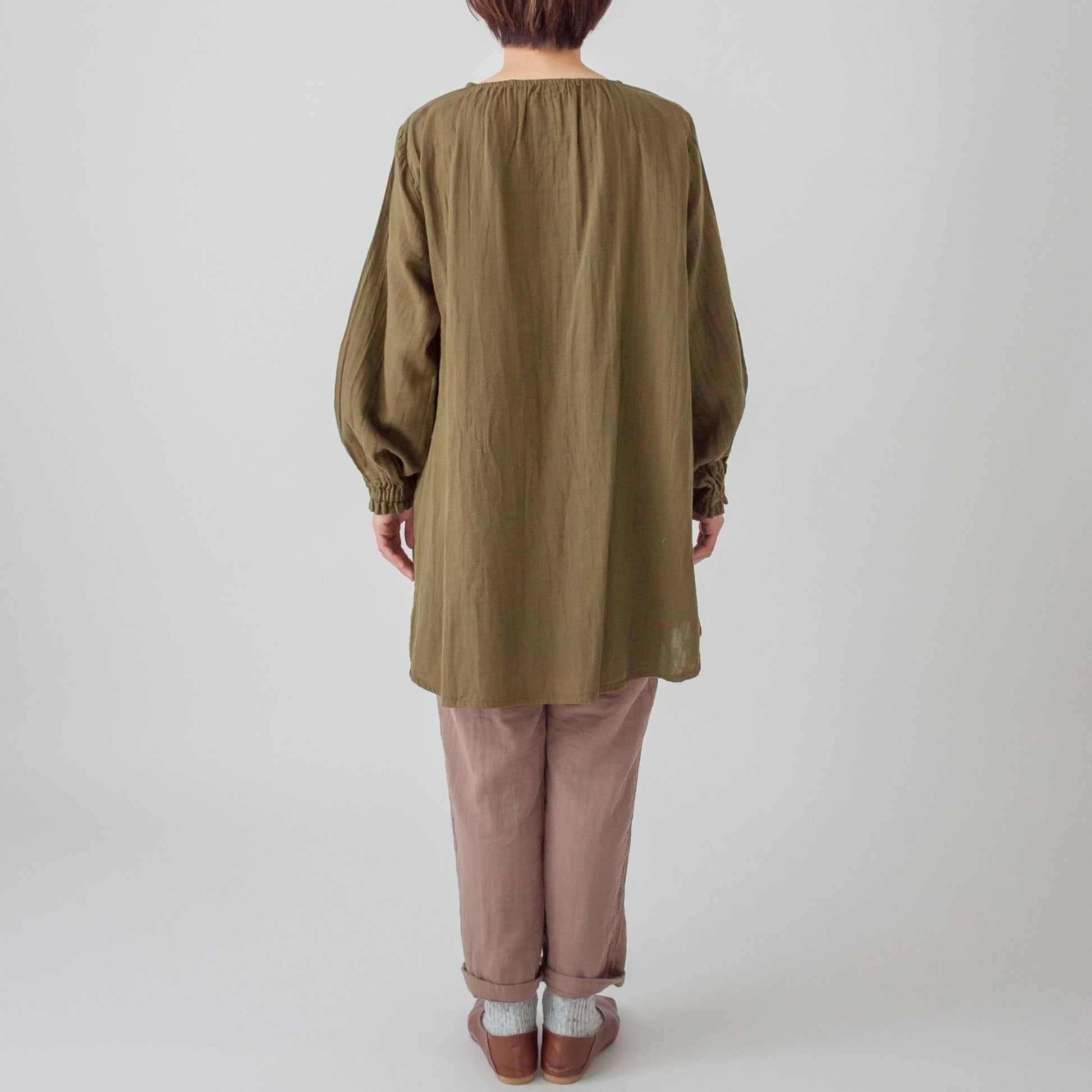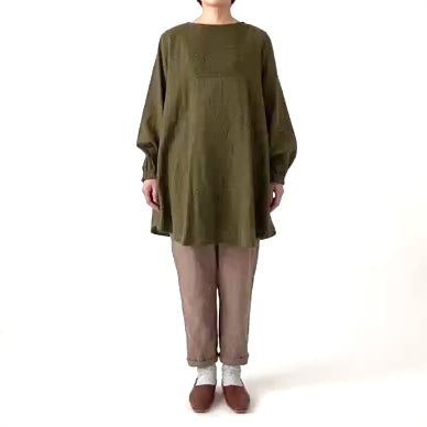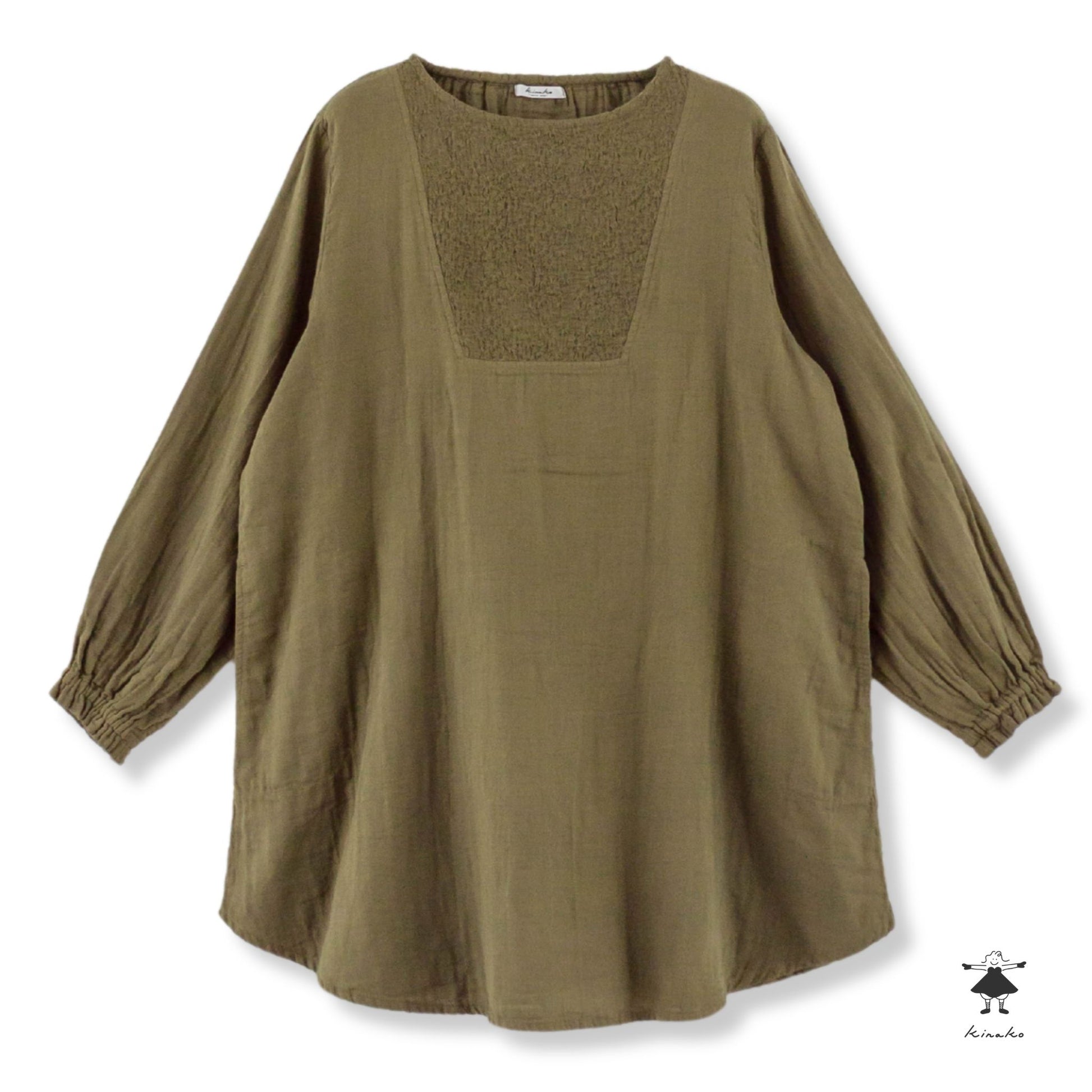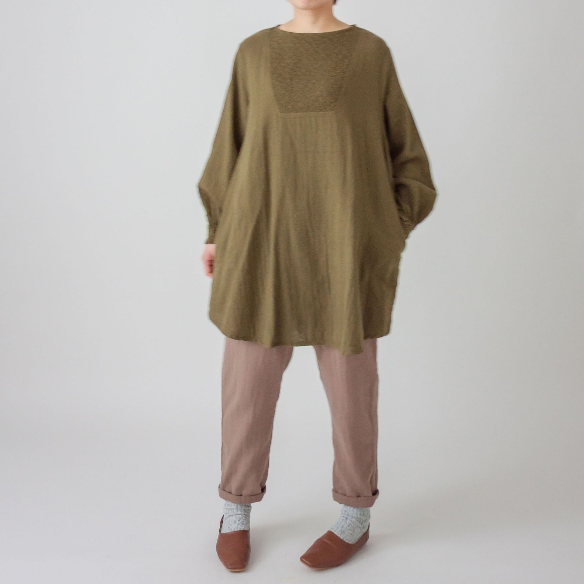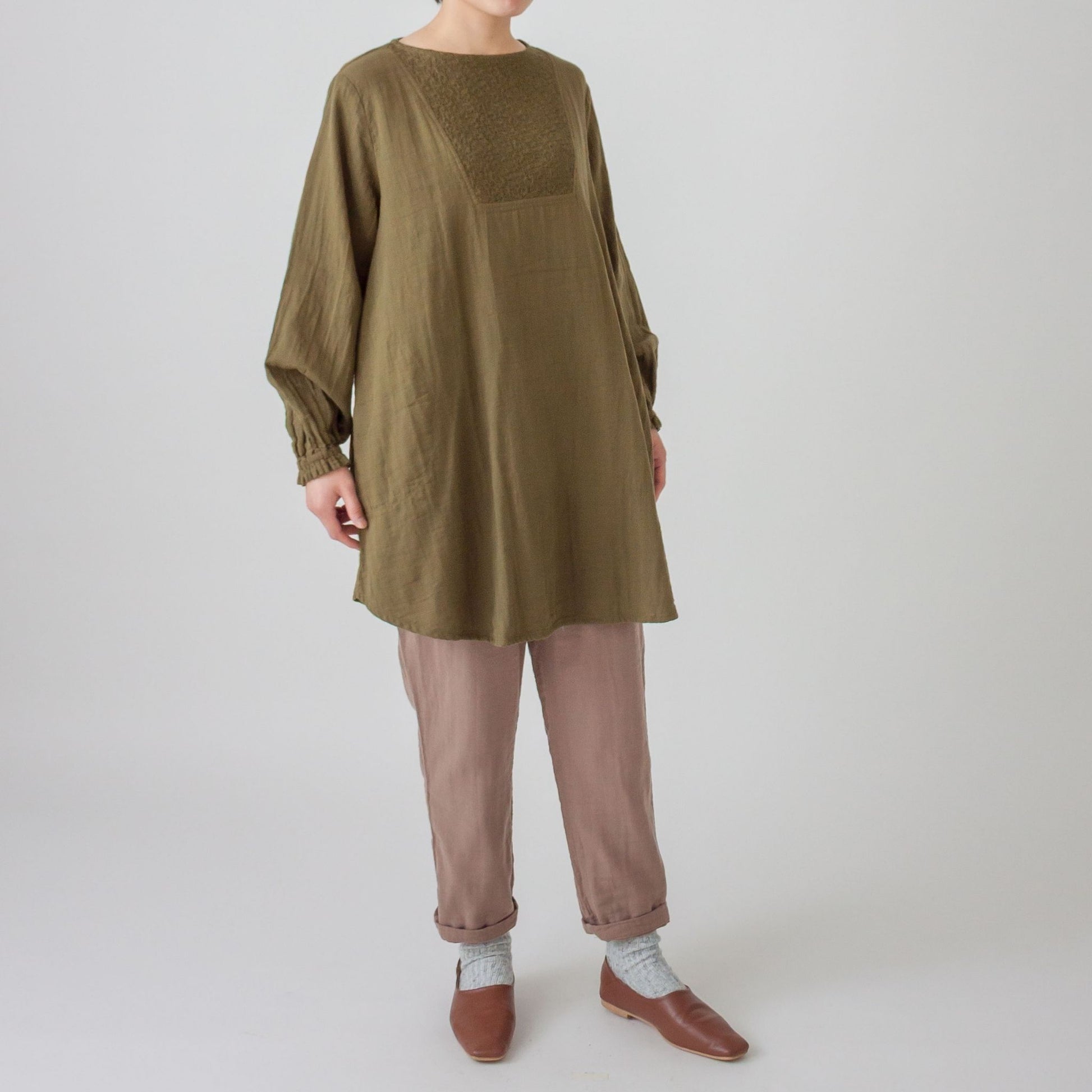 胸元の切替部分に花柄刺しゅう生地を使ったチュニックです。ゆったりしたサイズ感で着やすく、衿開きを抑えつつ脱ぎ着が楽な様に衿後ろにゴムを入れています。