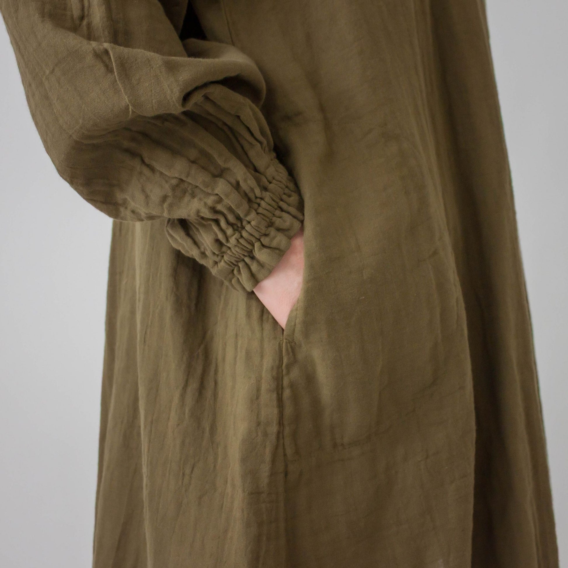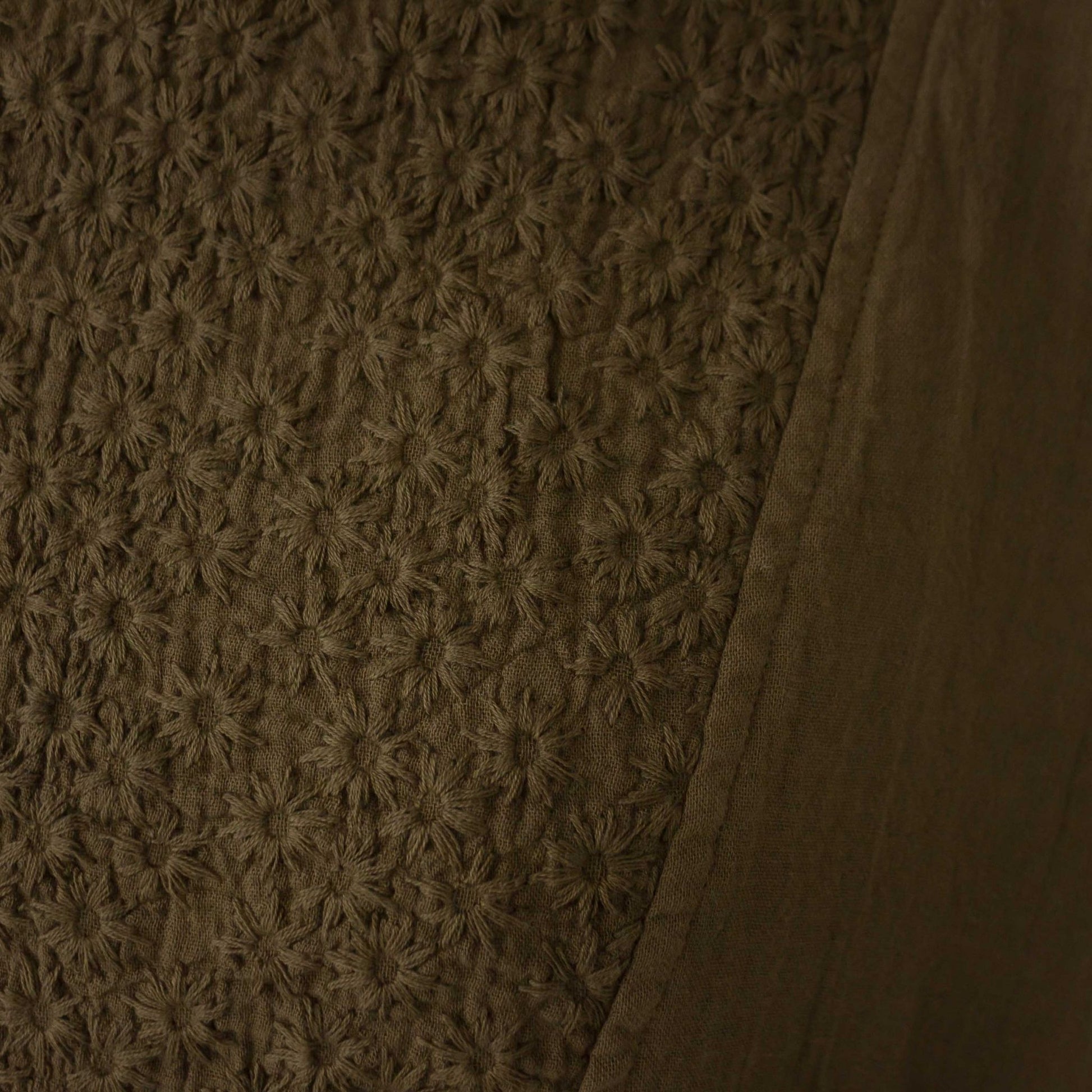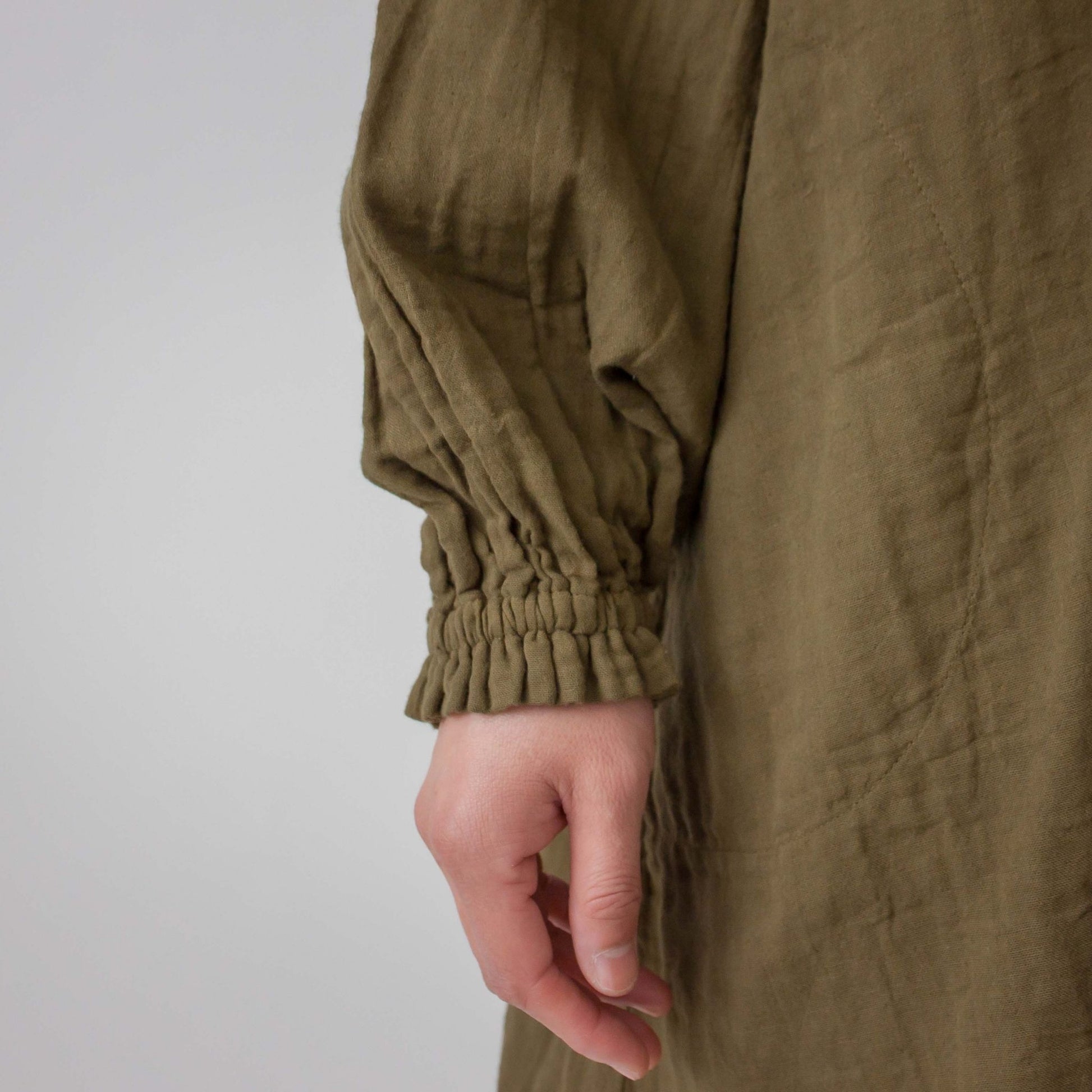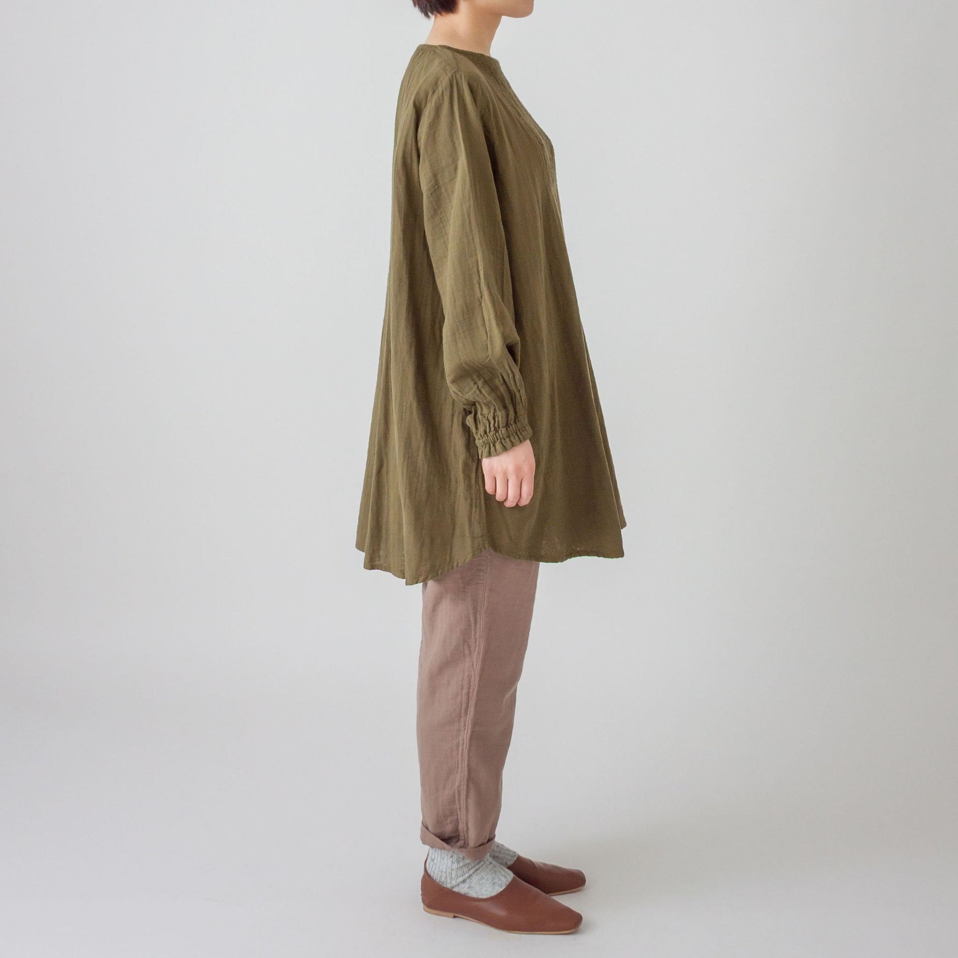 胸元の切替部分に花柄刺しゅう生地を使ったチュニックです。ゆったりしたサイズ感で着やすく、衿開きを抑えつつ脱ぎ着が楽な様に衿後ろにゴムを入れています。